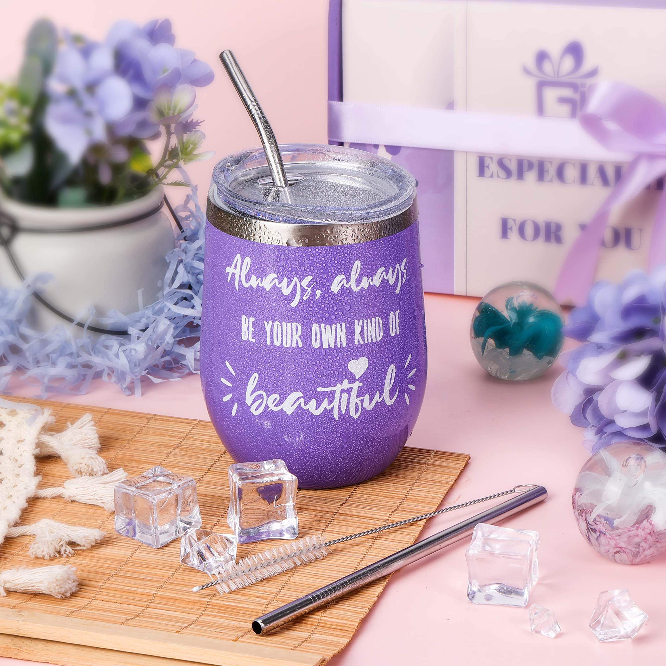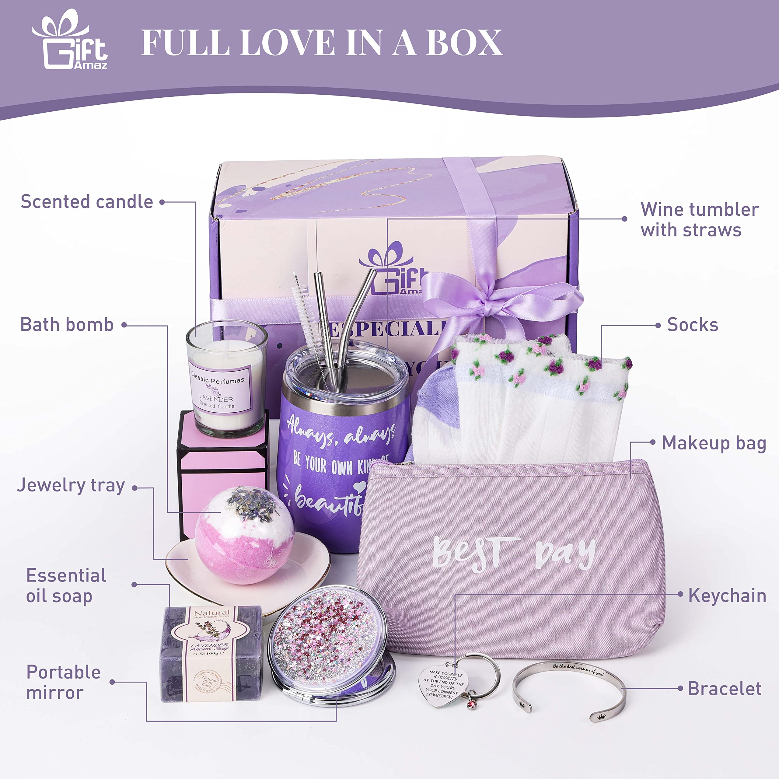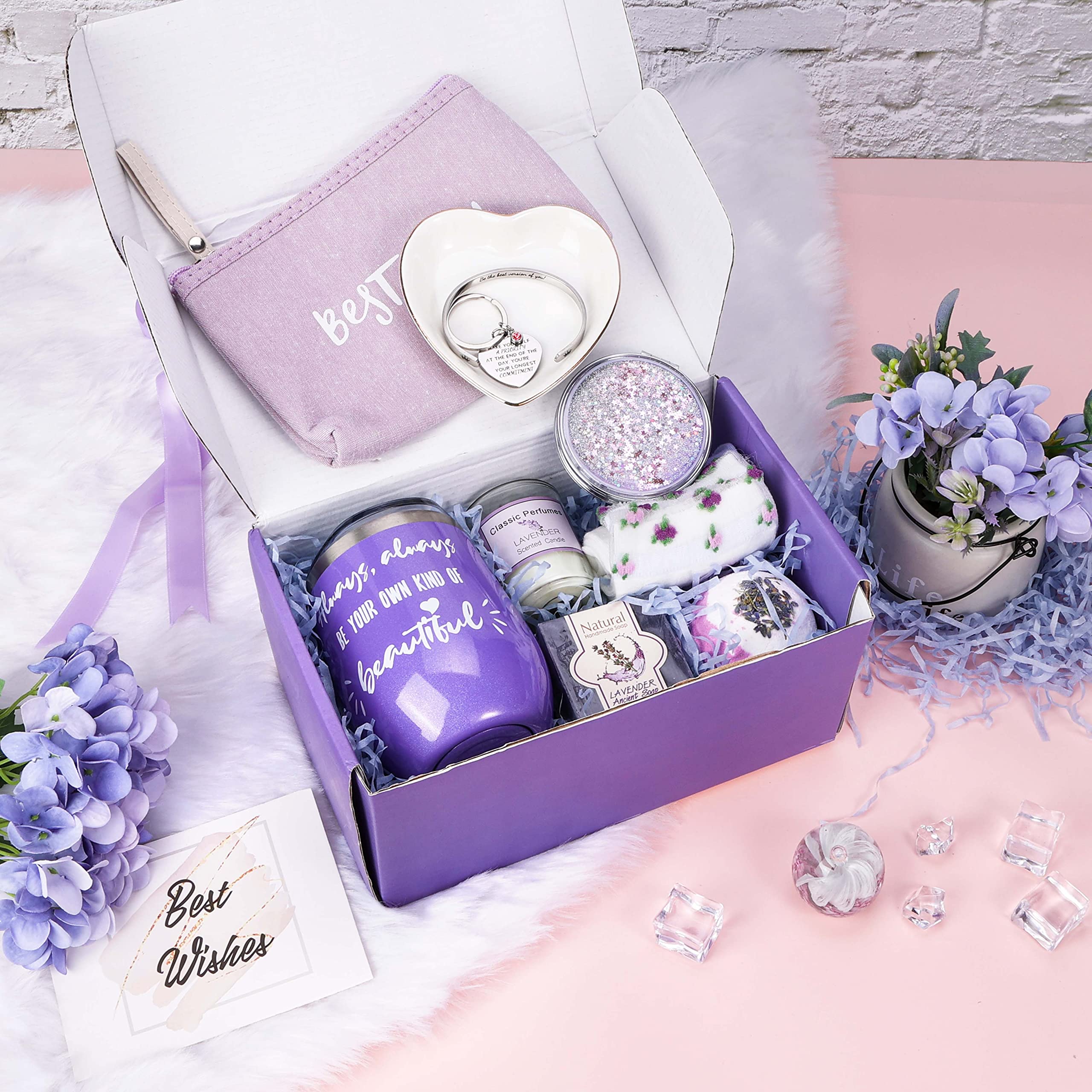 UNIQUE PURPLE GIFTS FOR WOMEN: Our gift design with the popular color of 2022, meaning of maintaining curiosity and imagination to create your own wonderful. The wine tumbler, keychain and bracelets, encouraged women can believed themselves and hope that women will be inspired and motivated when they see these inspiring words after receiving a gift, filled with lovely and thoughtful gifts inside, women will super surprise and happy to open this warm gift@COMPLETE GIFT BASKET FOR FEMALE: This unique birthday gifts for women included 13 items, such as 1 x purple wine tumbler (with straws and straw cleaner), 1 x lavender scented candle, 1 x lavender bath bomb, 1 x lavender essential oil soap, 1 x pair of socks, 1 x makeup bag, 1 x heart-shaped jewelry tray, 1 x purple quicksand makeup mirror, 1 x heart-shaped keychain, 1 x bracelet, 1 x warm card, 1 x charming box, all well packaged in one box, no need to repackage, time saving and money saving@WARM ENCOURAGEMEN GIFT: A warm care package gift for you easy to express your love and encouragement for women. Spa relaxing gifts, Lavender-scented soaps, bath bomb, and scented candles make women to relax during their spa treatments. Cosmetic bags, quicksand makeup mirrors, love jewelry boxes, bracelets, and keychains meet the needs of ladies for travel and dressing. Socks, wine tumbler, straws scrubbing not only shows you care for her but also warms her heart@GREAT GIFTS FOR ANY OCCASION: Just express your love generously, let women know your care, warm their heart and encouragement her moving forward. Great gift choice for best friend, mother, sister, wife, girlfriend or colleague, whether in birthday or Mother's day, anniversary, New Mom gifts, Thanksgiving, Valentine's Day, Christmas Day, or Graduation gift, Thank You gift, Wedding, Engagement, Surgery recovery gifts, Sympathy gift, this gift set is a surprise and sweet gift for your love one@PREMIUM MATERIALS: The purple tumbler with rainbow lacquer coated finish is made with double-wall vacuum insulated, high-quality food-grade stainless steel, rust & scratch resistant, keeps drinks hot or cold for hours. The bath bomb, the soap, and the candle are made from nourishing and soothing ingredients such as lavender, essential oil and 100% soy wax. If you have any problem for the gift, please contact us, we will respond within 24 hours and give anyone a happy experience