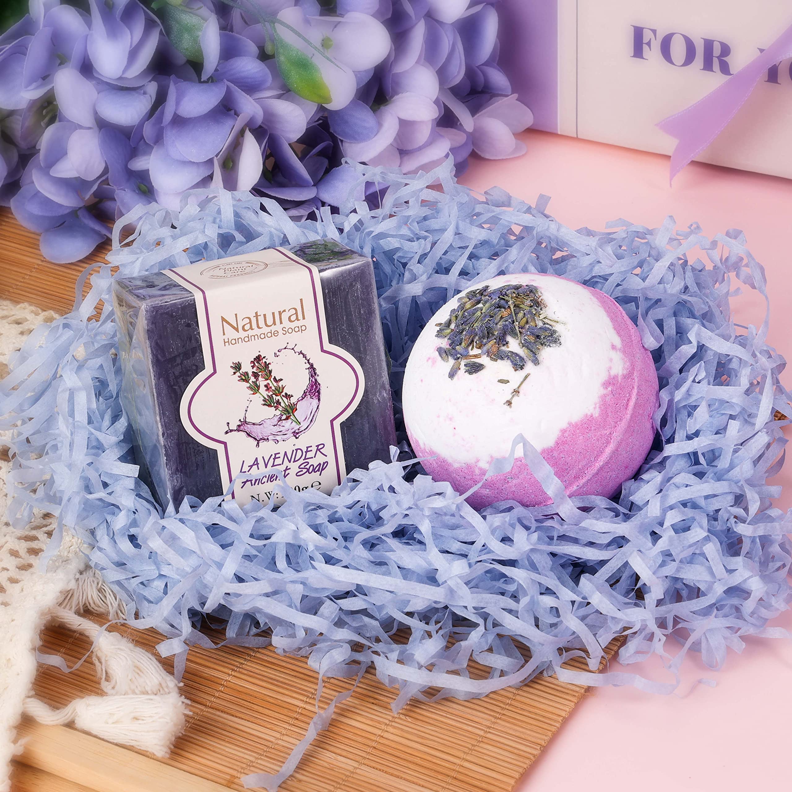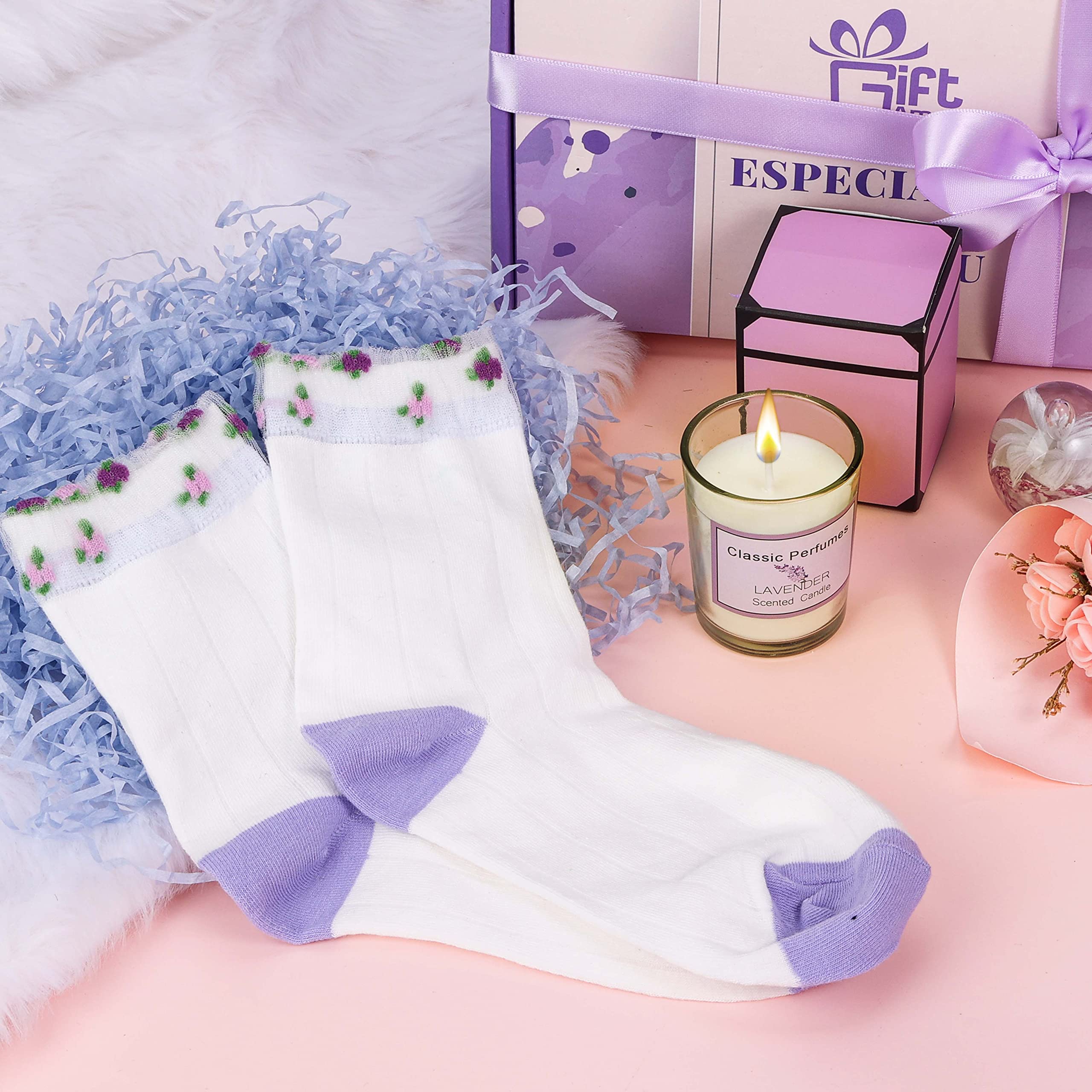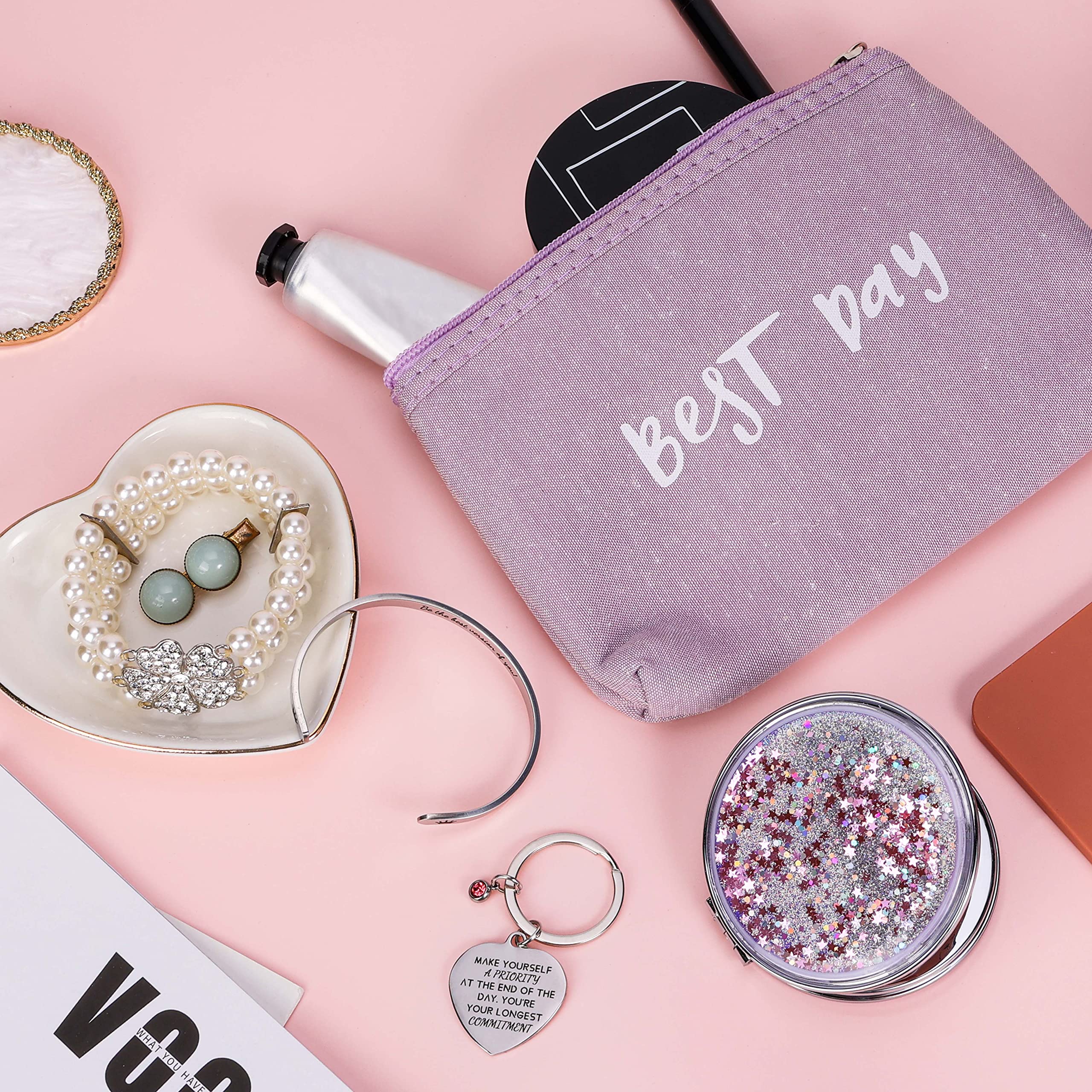 UNIQUE PURPLE GIFTS FOR WOMEN: Our gift design with the popular color of 2022, meaning of maintaining curiosity and imagination to create your own wonderful. The wine tumbler, keychain and bracelets, encouraged women can believed themselves and hope that women will be inspired and motivated when they see these inspiring words after receiving a gift, filled with lovely and thoughtful gifts inside, women will super surprise and happy to open this warm gift@COMPLETE GIFT BASKET FOR FEMALE: This unique birthday gifts for women included 13 items, such as 1 x purple wine tumbler (with straws and straw cleaner), 1 x lavender scented candle, 1 x lavender bath bomb, 1 x lavender essential oil soap, 1 x pair of socks, 1 x makeup bag, 1 x heart-shaped jewelry tray, 1 x purple quicksand makeup mirror, 1 x heart-shaped keychain, 1 x bracelet, 1 x warm card, 1 x charming box, all well packaged in one box, no need to repackage, time saving and money saving@WARM ENCOURAGEMEN GIFT: A warm care package gift for you easy to express your love and encouragement for women. Spa relaxing gifts, Lavender-scented soaps, bath bomb, and scented candles make women to relax during their spa treatments. Cosmetic bags, quicksand makeup mirrors, love jewelry boxes, bracelets, and keychains meet the needs of ladies for travel and dressing. Socks, wine tumbler, straws scrubbing not only shows you care for her but also warms her heart@GREAT GIFTS FOR ANY OCCASION: Just express your love generously, let women know your care, warm their heart and encouragement her moving forward. Great gift choice for best friend, mother, sister, wife, girlfriend or colleague, whether in birthday or Mother's day, anniversary, New Mom gifts, Thanksgiving, Valentine's Day, Christmas Day, or Graduation gift, Thank You gift, Wedding, Engagement, Surgery recovery gifts, Sympathy gift, this gift set is a surprise and sweet gift for your love one@PREMIUM MATERIALS: The purple tumbler with rainbow lacquer coated finish is made with double-wall vacuum insulated, high-quality food-grade stainless steel, rust & scratch resistant, keeps drinks hot or cold for hours. The bath bomb, the soap, and the candle are made from nourishing and soothing ingredients such as lavender, essential oil and 100% soy wax. If you have any problem for the gift, please contact us, we will respond within 24 hours and give anyone a happy experience