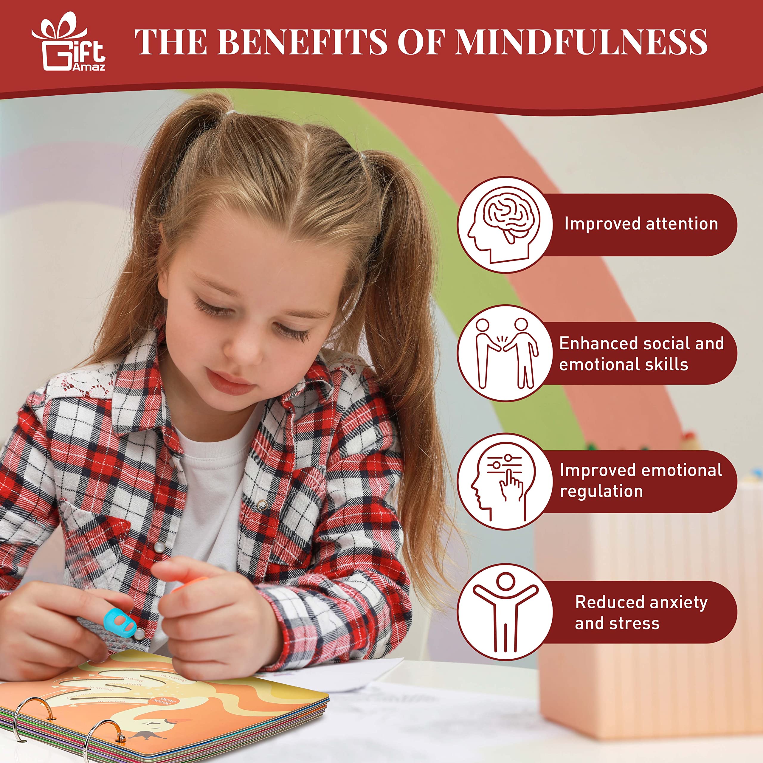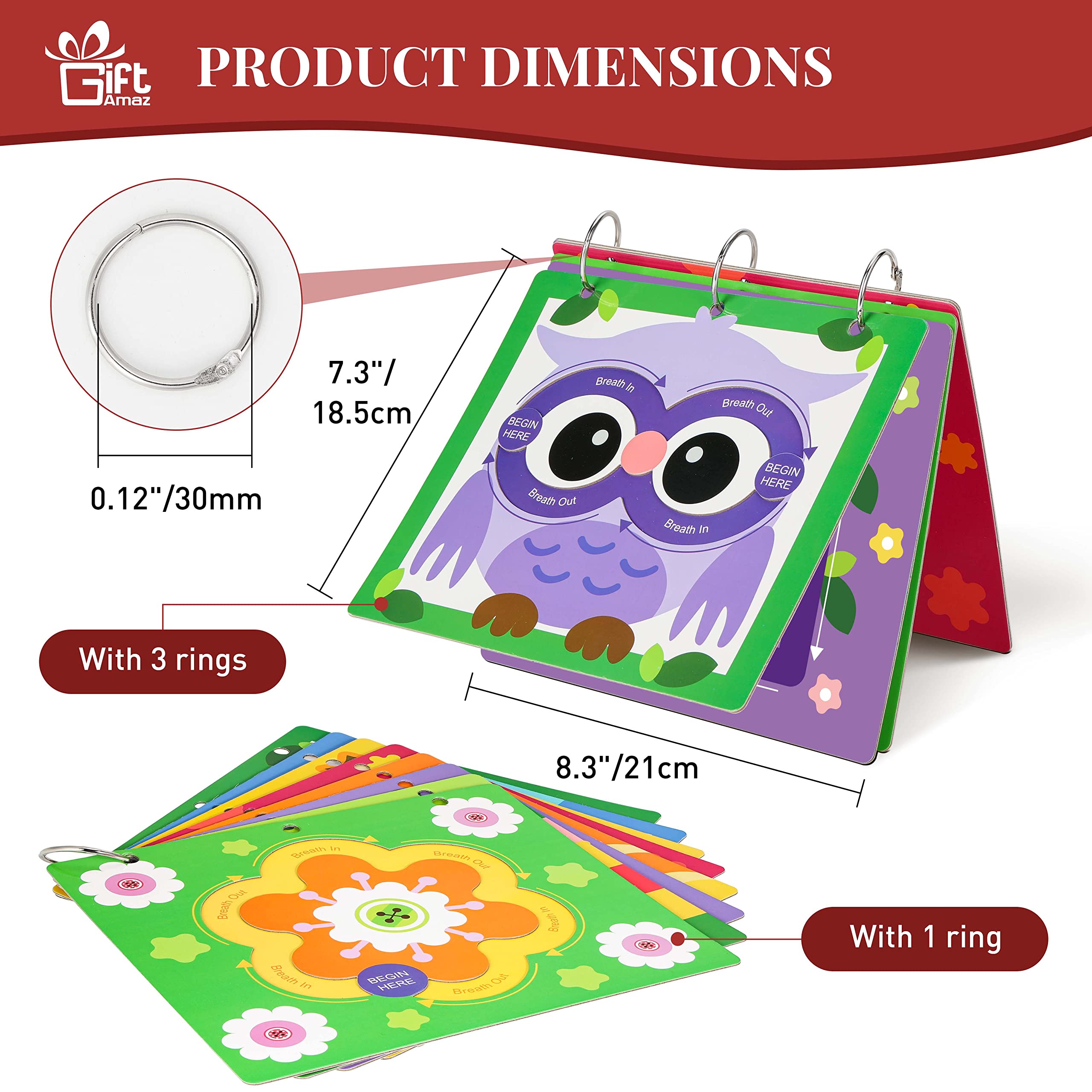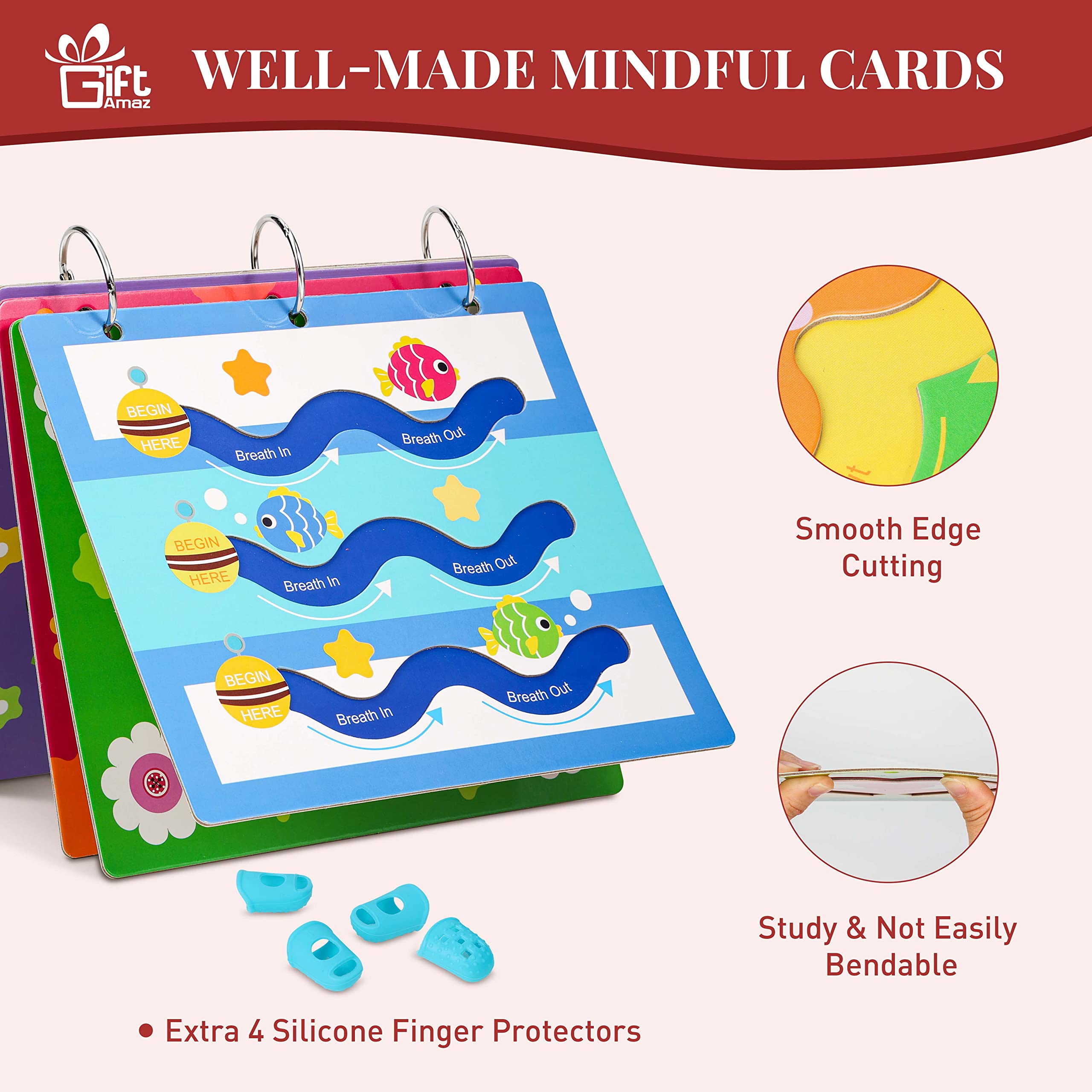 CALMING TOY FOR KIDS - Mindful maze boards is a great partner for kids to relax and stress relief. Breathing exercises for kids is a technique used to teach your child how to slow down their breathing to calm down and lower stress. This mindfulness set is a great screen free way for kids to sooth themselves by finger tracing the elements while doing breathing exercises, well improve the behavior and emotional well-being of all kids@MINDFUL MAZE BOARDS - Comes with 8 different mindfulness breathing boards with 8 kinds of funny designs with bright colors, printed with detailed breathing exercise steps, to help kids exercise their mindfulness breathing skills. There are two ways to use the mindful breathing book by putting on 1 ring or 3 rings. And the silicone fingertips will well protect the kids’ skin, you can combine all boards to a mindful book for kids easy to use@SOCIAL EMOTIONAL LEARNING ACTIVITIES - The calming corner items for children focus on themselves, social emotional learning, good for kids over 3 years old to learn, great gift for birthday, Christmas, any holiday party. Kids will feel relaxing and calming down after they finished mindfulness learning, parent and grandparent must happy for the changing of boys and girls@DEVELOP STRESS COPING SKILLS - By teaching mindfulness to kids, this set gives them the tools they need to improve concentration, build confidence, cope with stress, and relate to uncomfortable or challenging moments. The earlier kids learn mindfulness, the greater the opportunity to cope with their own feelings and cultivate resilience@SENSORY TOYS FOR WIDELY APPLICATION - These sensory calming toys are widely applicable to various occasions, such as classroom, daycare or home calming corners, occupational therapy activities, mindful moments, yoga breathing, self regulation, finger tracing, sensory and movement breaks and so on. Great to assist calm children, anxiety relief and provide them a way to self soothe