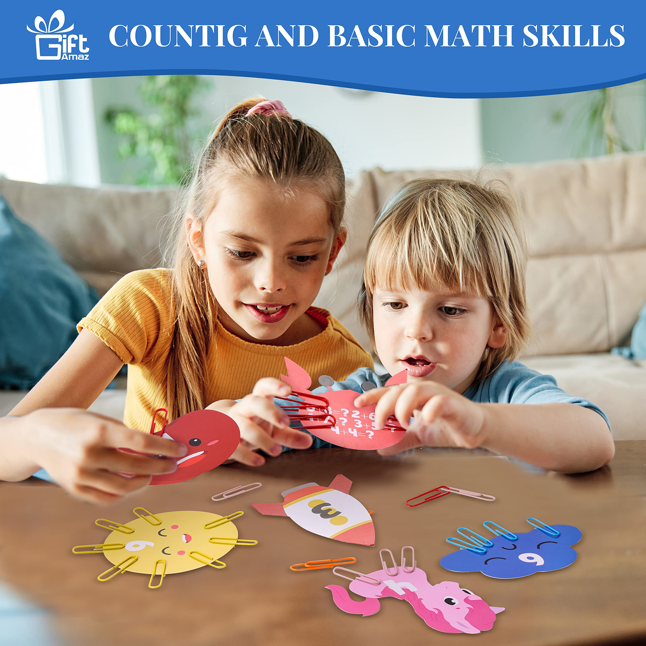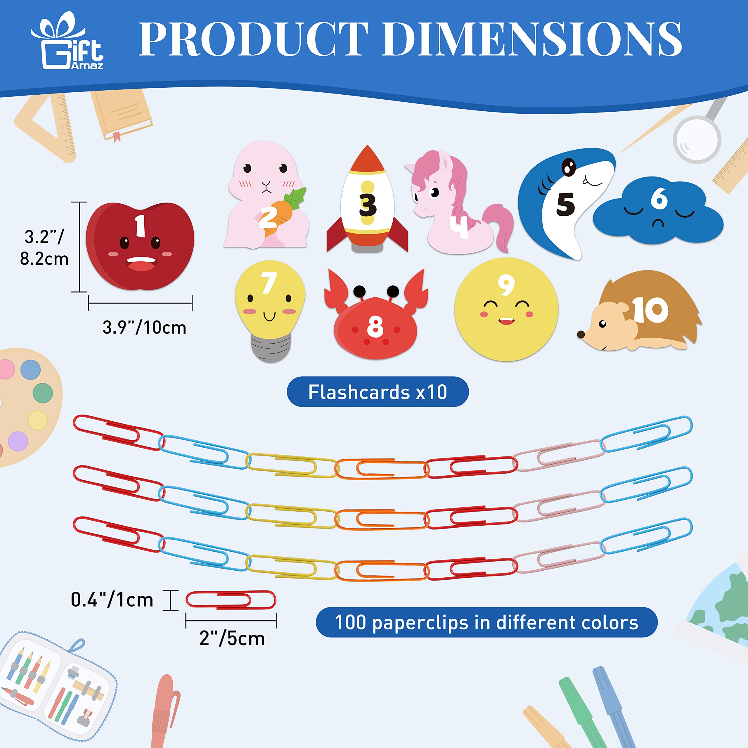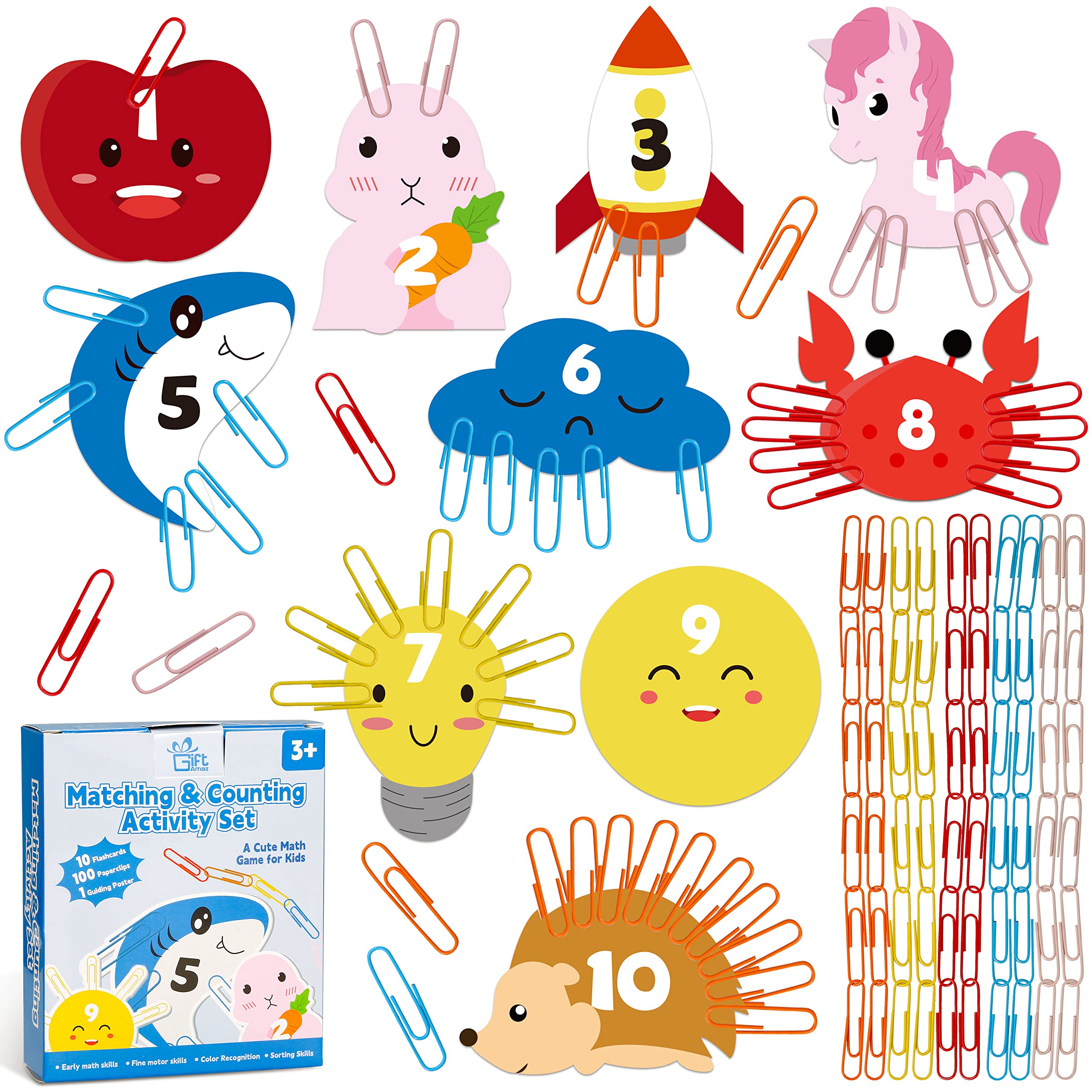 MATH COUNTING LEARNING TOY - Our unique math manipulatives learning toys with 100 x Chain links paperclips, 10 x Math flash card, 1 x manual, each math card with cute design and math addition learning, cute design can well catch children’s attention, great learning tool for kids to recognize numbers, learn to count, and learn early math, build children's interest in mathematics at an early age@IMPROVES EARLY MATH SKILL - The core of this game is to place paper clips on the cards to complete the pattern. Each card requires a different color paperclip. For example, you can place a pink paper clip on a card with a pink bunny pattern to make it a bunny with ears. This will help improve your child's color recognition, grouping skills, sorting skills, and early math skills@DEVELOP FINE MOTOR SKILL - This math counting toys can well help kids develop hand-eye coordination and spatial skills to make movements. Children should count the clicks and use the paperclip place on the card, connecting and separating paper clips on cards to develop key skills for the future and is a fundamental STEM toy for boys and girls@CUTE MATH FLASH CARD - Come with 10 cute math flash cards, kids can learn fun by creating cute patterns with different colored paper clips. Children are more willing to participate and find the learning more memorable. Colorful flashcards with cute illustrations are more likely to attract children's attention and make them more focused@EAUCATIONAL GIFT FOR KIDS - Our early math counting toy is great for kids learning math, charming package that you can send as gift for kids toddlers preschoolers kindergarten in Birthday, Christmas, New Year or any holiday party. Kids will surprise and love this such cute design math material toy