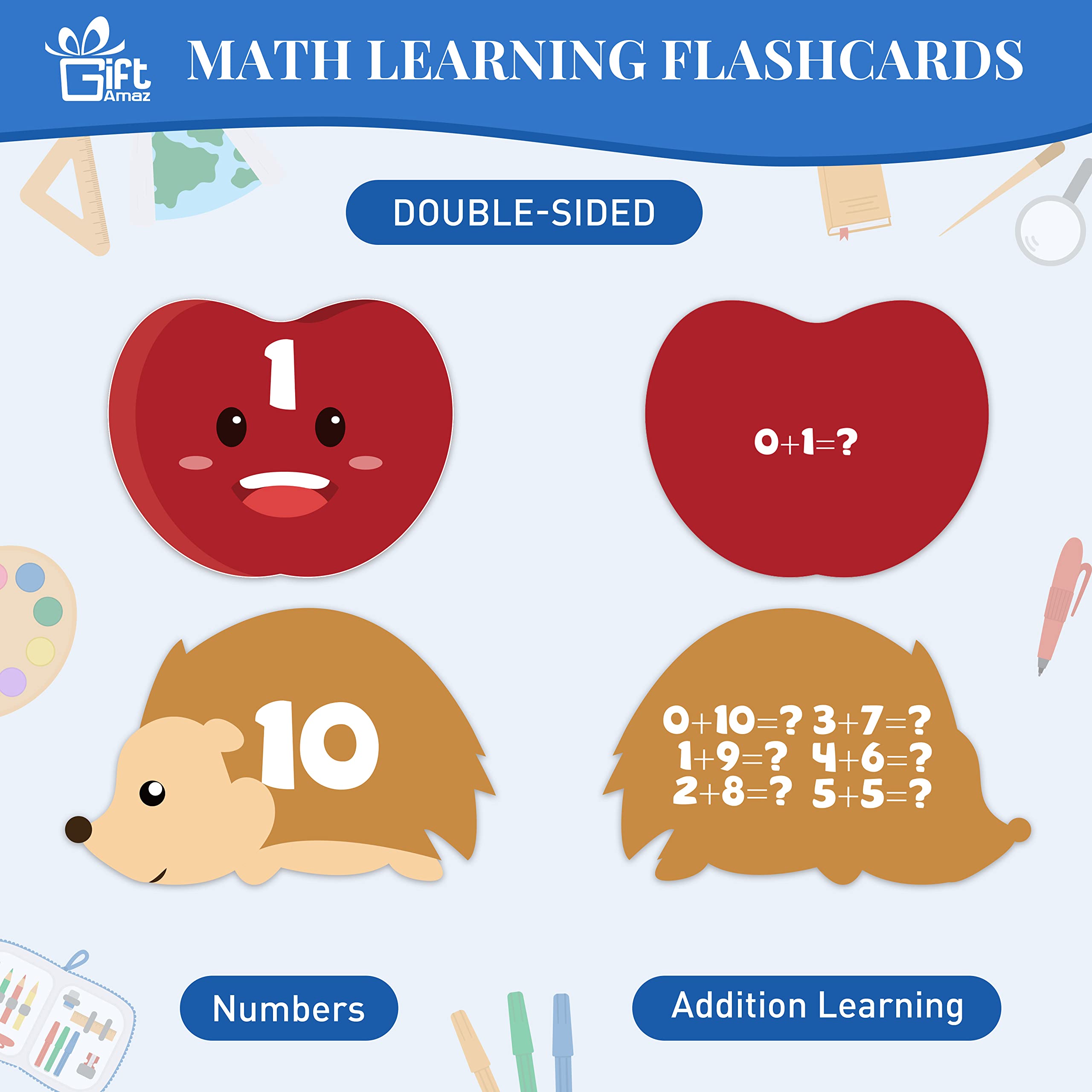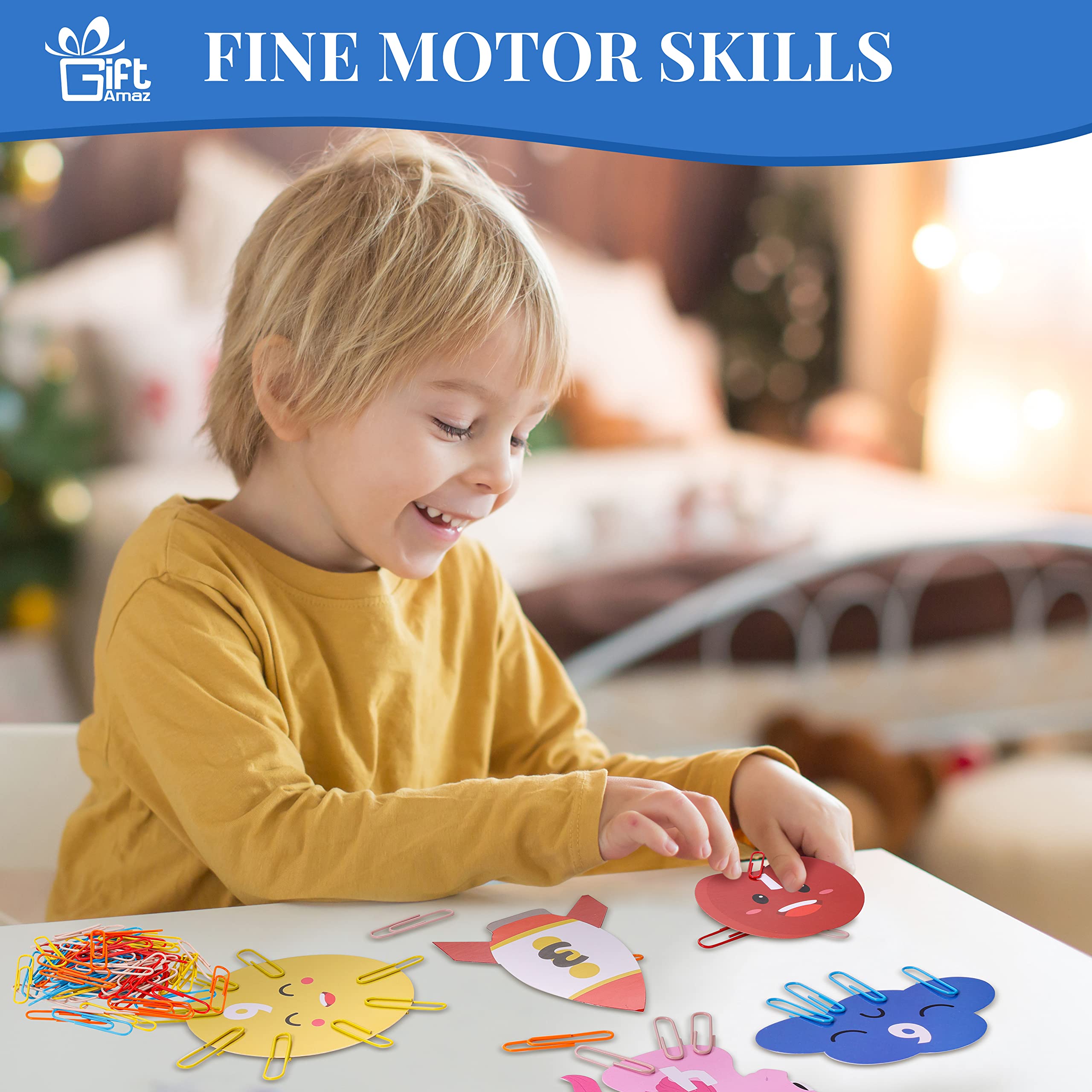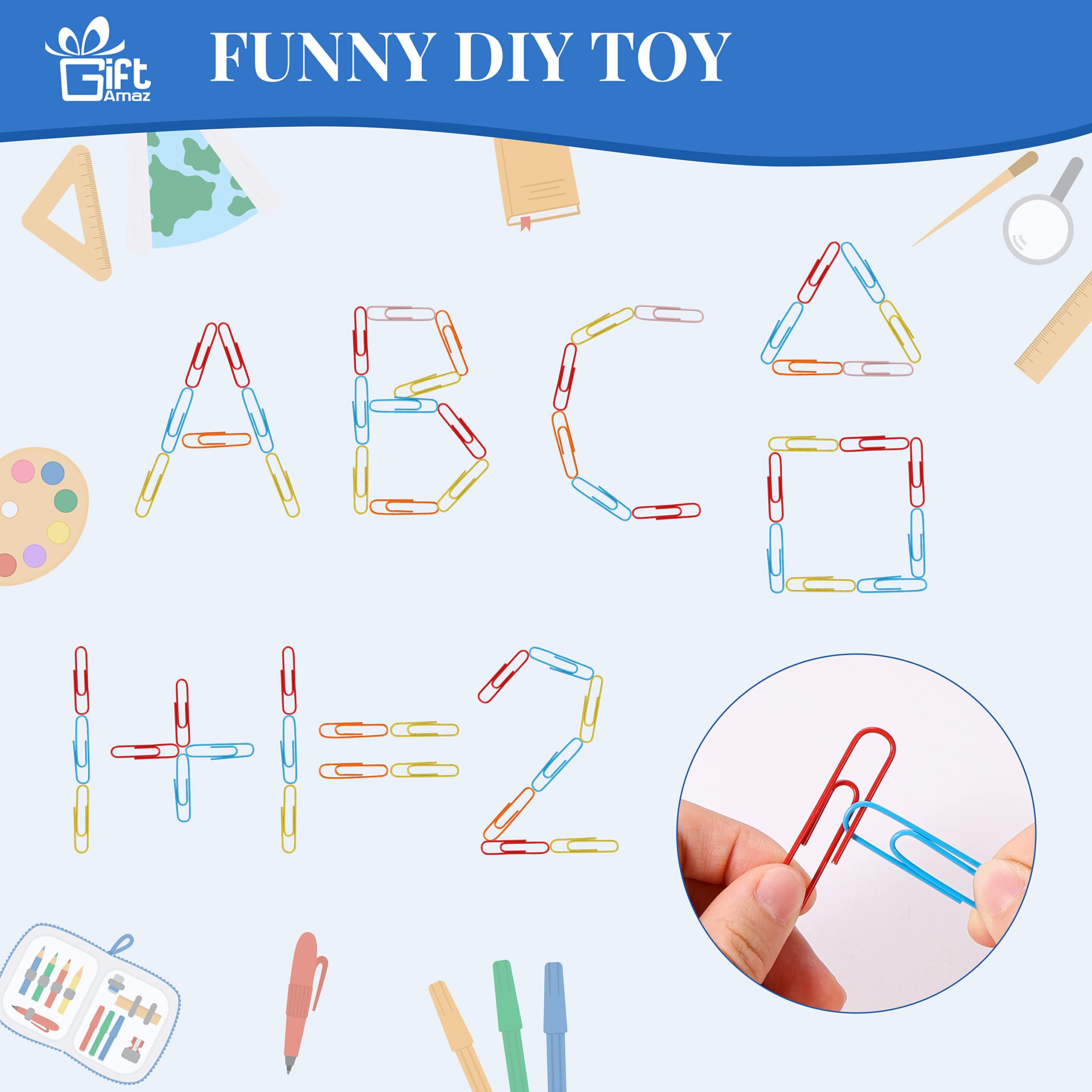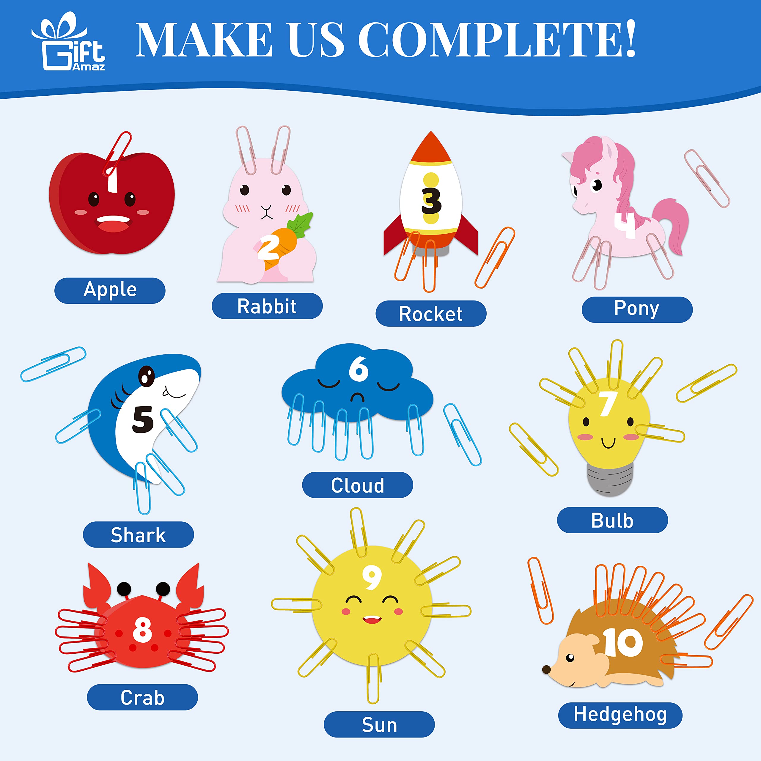MATH COUNTING LEARNING TOY - Our unique math manipulatives learning toys with 100 x Chain links paperclips, 10 x Math flash card, 1 x manual, each math card with cute design and math addition learning, cute design can well catch children’s attention, great learning tool for kids to recognize numbers, learn to count, and learn early math, build children's interest in mathematics at an early age@IMPROVES EARLY MATH SKILL - The core of this game is to place paper clips on the cards to complete the pattern. Each card requires a different color paperclip. For example, you can place a pink paper clip on a card with a pink bunny pattern to make it a bunny with ears. This will help improve your child's color recognition, grouping skills, sorting skills, and early math skills@DEVELOP FINE MOTOR SKILL - This math counting toys can well help kids develop hand-eye coordination and spatial skills to make movements. Children should count the clicks and use the paperclip place on the card, connecting and separating paper clips on cards to develop key skills for the future and is a fundamental STEM toy for boys and girls@CUTE MATH FLASH CARD - Come with 10 cute math flash cards, kids can learn fun by creating cute patterns with different colored paper clips. Children are more willing to participate and find the learning more memorable. Colorful flashcards with cute illustrations are more likely to attract children's attention and make them more focused@EAUCATIONAL GIFT FOR KIDS - Our early math counting toy is great for kids learning math, charming package that you can send as gift for kids toddlers preschoolers kindergarten in Birthday, Christmas, New Year or any holiday party. Kids will surprise and love this such cute design math material toy