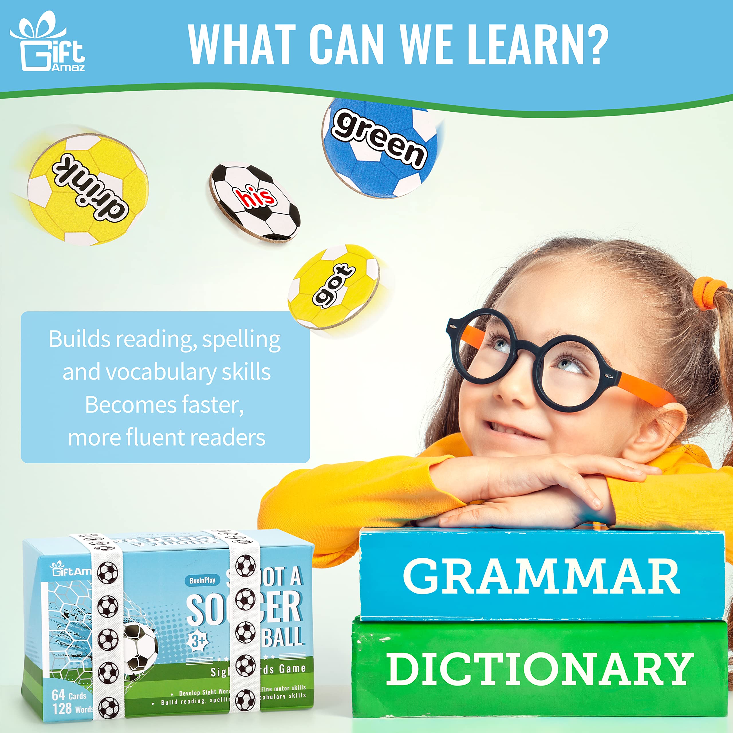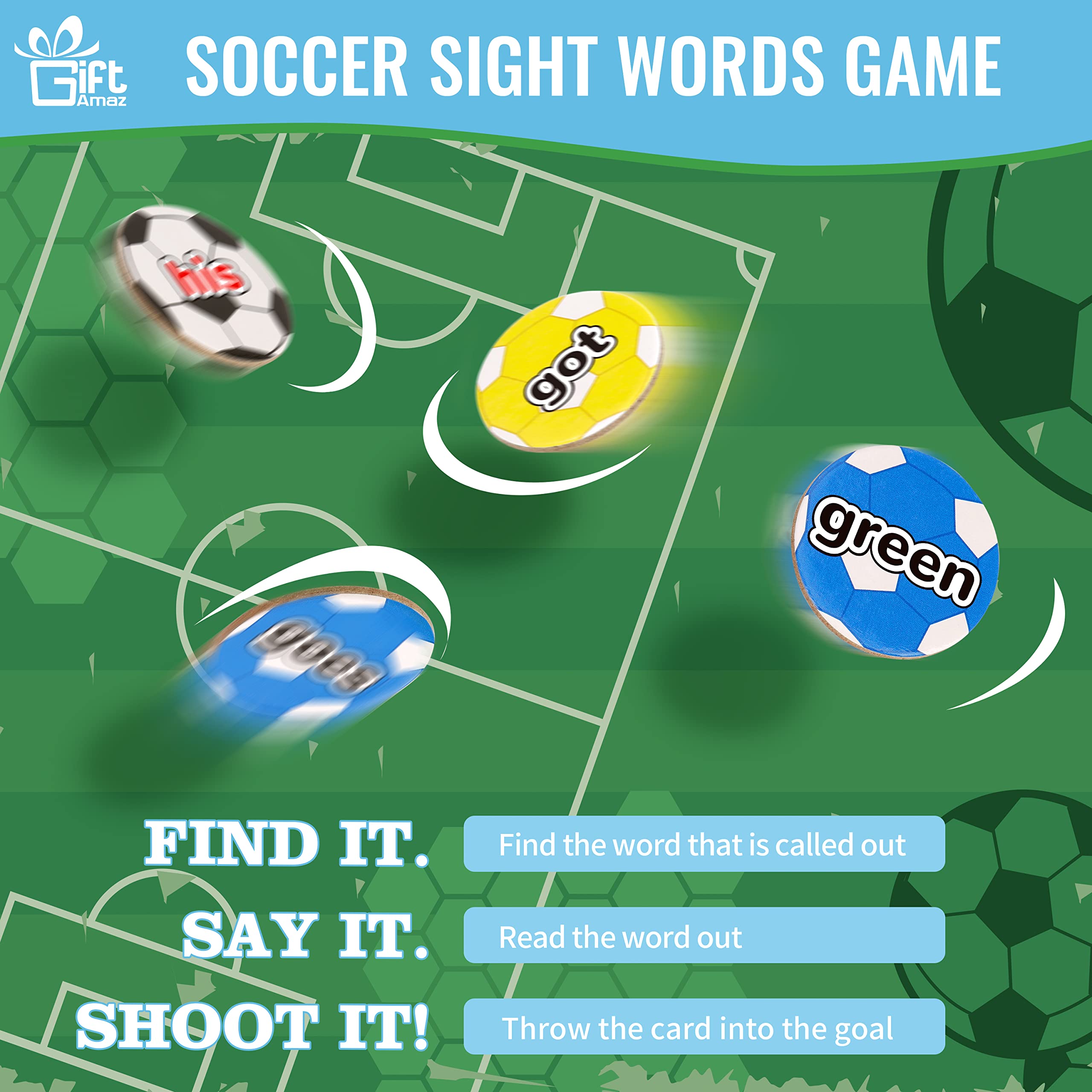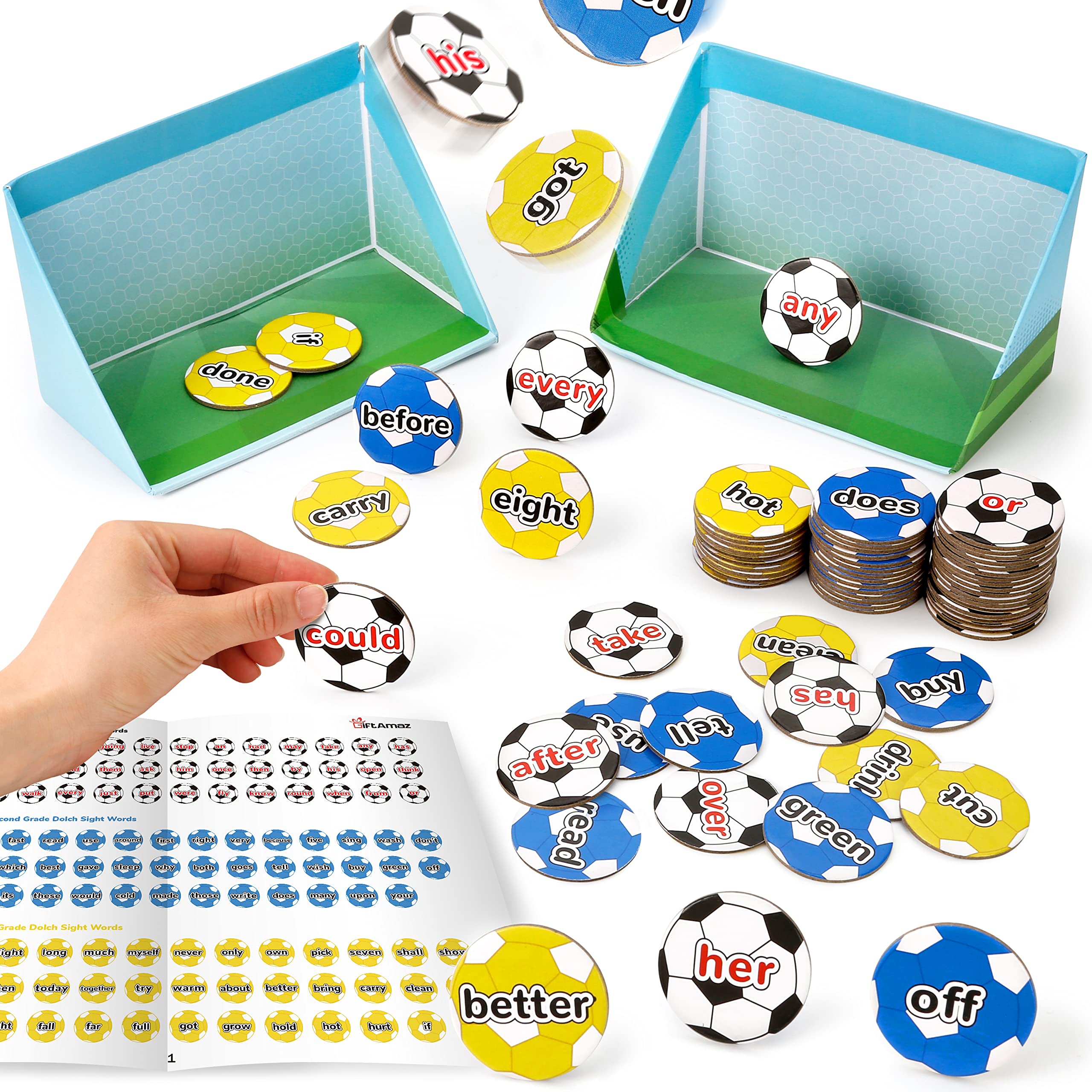 SOCCER SIGHT WORD GAMES: This charming flash card set makes sight word learning fun and engaging by incorporating it into an exciting soccer game. Playing soccer games helps children recognize, read, pronounce, spell, and master sight words while also improving their hand-eye coordination and reaction skills. Younger children can place the cards directly into the goal to make the game easier@BOX DOUBLES AS PLAYSET: Our box serves a dual purpose as both a playset and storage container. It can be separated into two soccer goals, providing a target for children to toss their cards. Furthermore, the box teaches children the importance of keeping a tidy space by serving as a tool for organization. The compact size also makes it convenient for travel, allowing kids to learn on-the-go@SINGLE & MULTIPLAYER LEARNING GAMES: Children can have a fun practicing sight words by using the flash cards in a soccer-style game. This playful approach adds excitement to the learning process, and kids can enjoy playing solo or with friends and family. In a two-player game, each child has their own soccer goal and tosses the cards back and forth. Larger groups can split into two teams for a soccer-themed sight word competition@SIGHT WORDS FLASH CARDS: The flashcards are color-coded, making it easier for children to recognize and concentrate on them. The cards are also sturdy and simple to handle. The soccer flash card set includes 128 sight words categorized by grade level (black-white for 1st grade, blue for 2nd grade, and yellow for 3rd grade). Suitable for children ages 4 to 9. These high-frequency words are commonly found in general text, mastering these words is a critical goal in education@EDUCATIONAL GIFT FOR KIDS: Our unique soccer-themed sight word learning set will be a great gift for 4-9 years old. Perfect learning tool for Pre-Primer/ Primer/ First Grade/ Second Grade/ Third Grade. Boys girls will be happy to receive such new-style learning materials on birthdays, Christmas, back to school or any holiday party. A novel way to learn, and that's what is important to keep kids interested