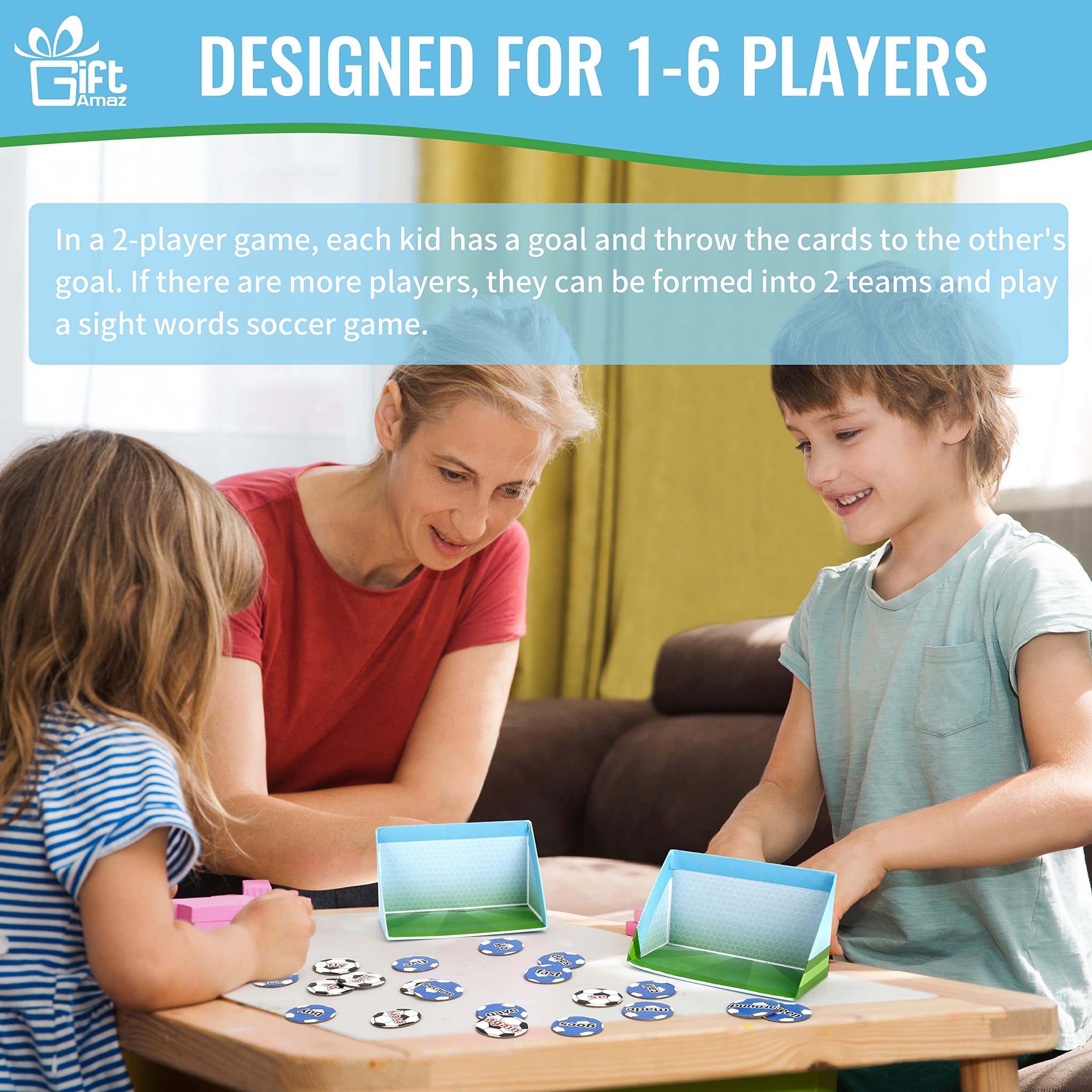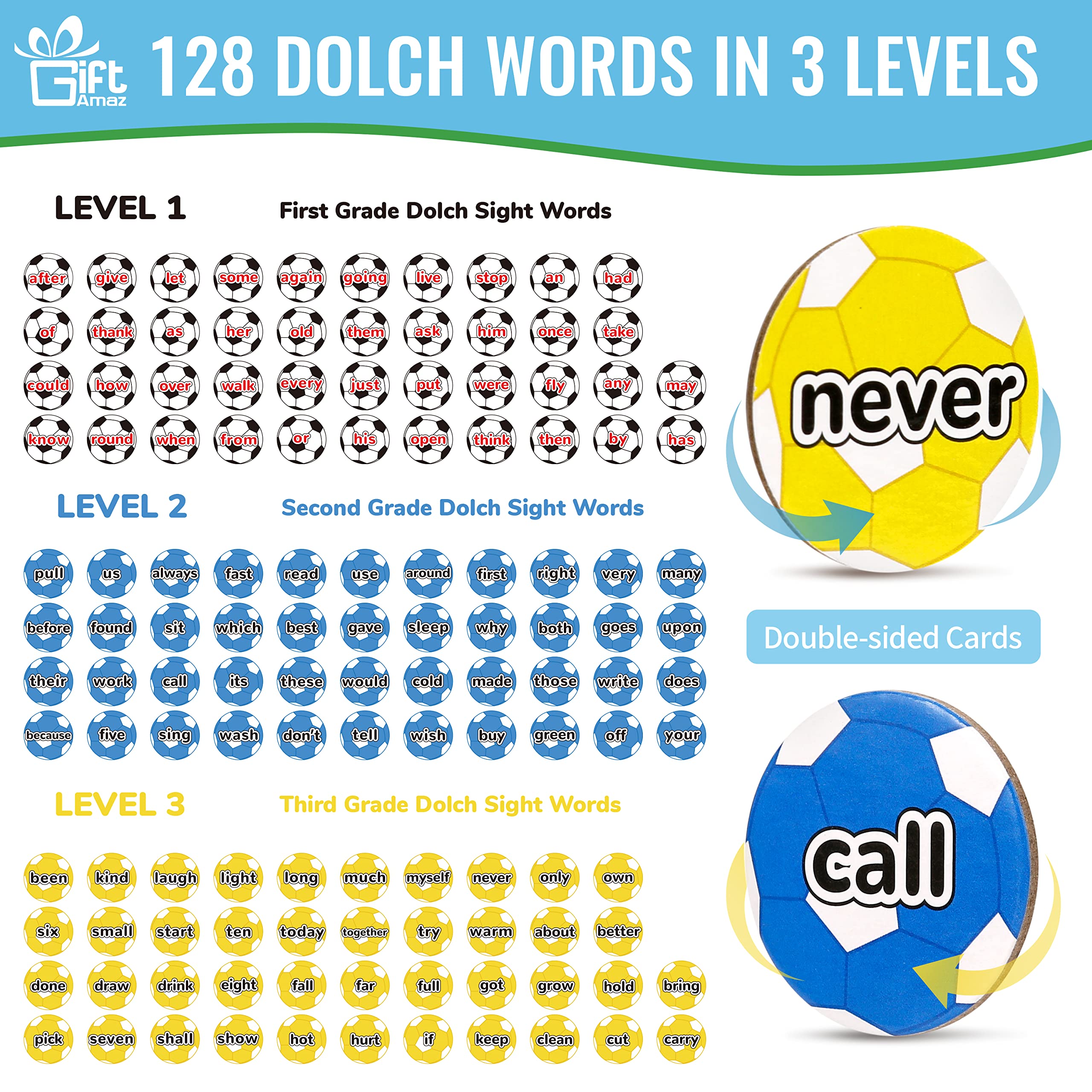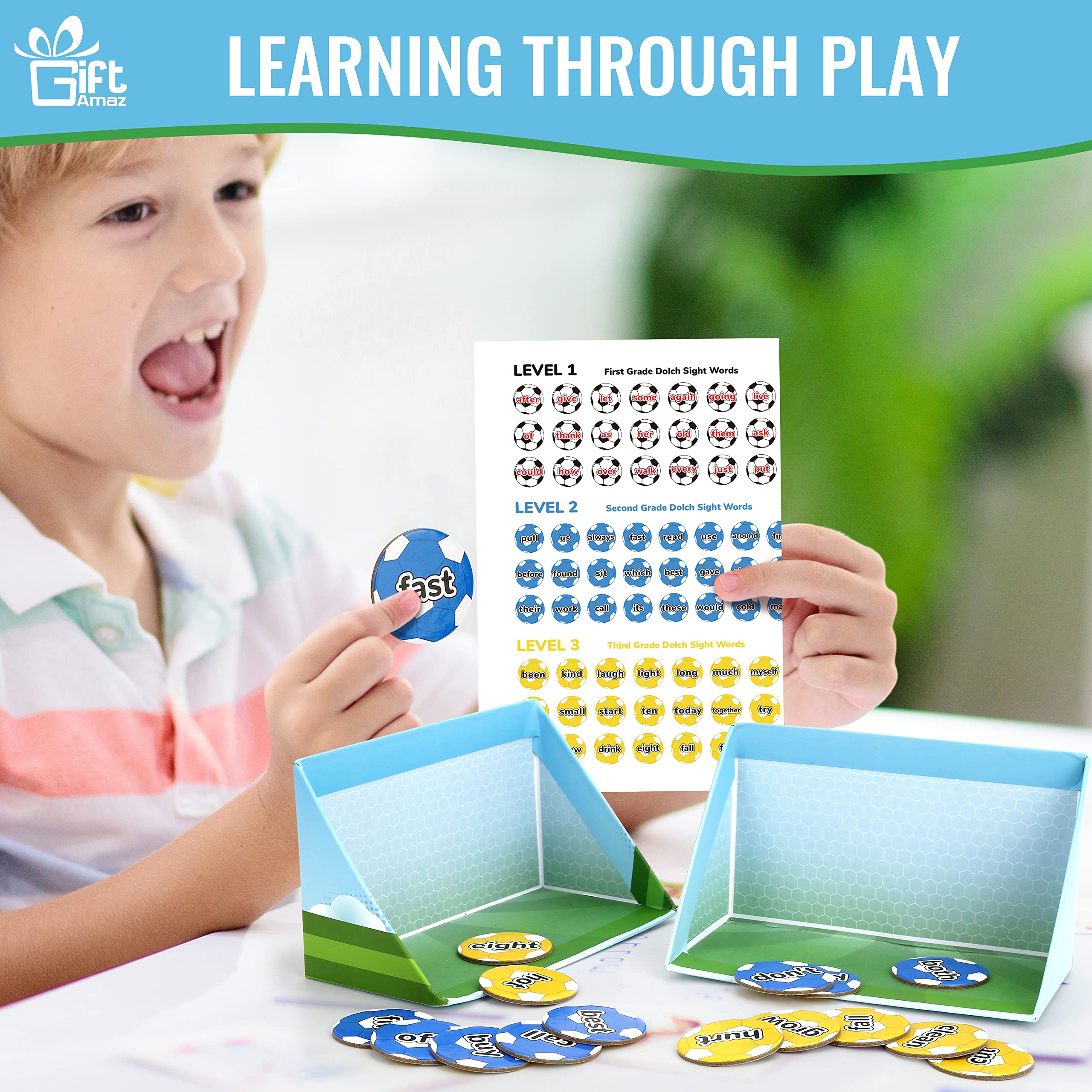 SOCCER SIGHT WORD GAMES: This charming flash card set makes sight word learning fun and engaging by incorporating it into an exciting soccer game. Playing soccer games helps children recognize, read, pronounce, spell, and master sight words while also improving their hand-eye coordination and reaction skills. Younger children can place the cards directly into the goal to make the game easier@BOX DOUBLES AS PLAYSET: Our box serves a dual purpose as both a playset and storage container. It can be separated into two soccer goals, providing a target for children to toss their cards. Furthermore, the box teaches children the importance of keeping a tidy space by serving as a tool for organization. The compact size also makes it convenient for travel, allowing kids to learn on-the-go@SINGLE & MULTIPLAYER LEARNING GAMES: Children can have a fun practicing sight words by using the flash cards in a soccer-style game. This playful approach adds excitement to the learning process, and kids can enjoy playing solo or with friends and family. In a two-player game, each child has their own soccer goal and tosses the cards back and forth. Larger groups can split into two teams for a soccer-themed sight word competition@SIGHT WORDS FLASH CARDS: The flashcards are color-coded, making it easier for children to recognize and concentrate on them. The cards are also sturdy and simple to handle. The soccer flash card set includes 128 sight words categorized by grade level (black-white for 1st grade, blue for 2nd grade, and yellow for 3rd grade). Suitable for children ages 4 to 9. These high-frequency words are commonly found in general text, mastering these words is a critical goal in education@EDUCATIONAL GIFT FOR KIDS: Our unique soccer-themed sight word learning set will be a great gift for 4-9 years old. Perfect learning tool for Pre-Primer/ Primer/ First Grade/ Second Grade/ Third Grade. Boys girls will be happy to receive such new-style learning materials on birthdays, Christmas, back to school or any holiday party. A novel way to learn, and that's what is important to keep kids interested