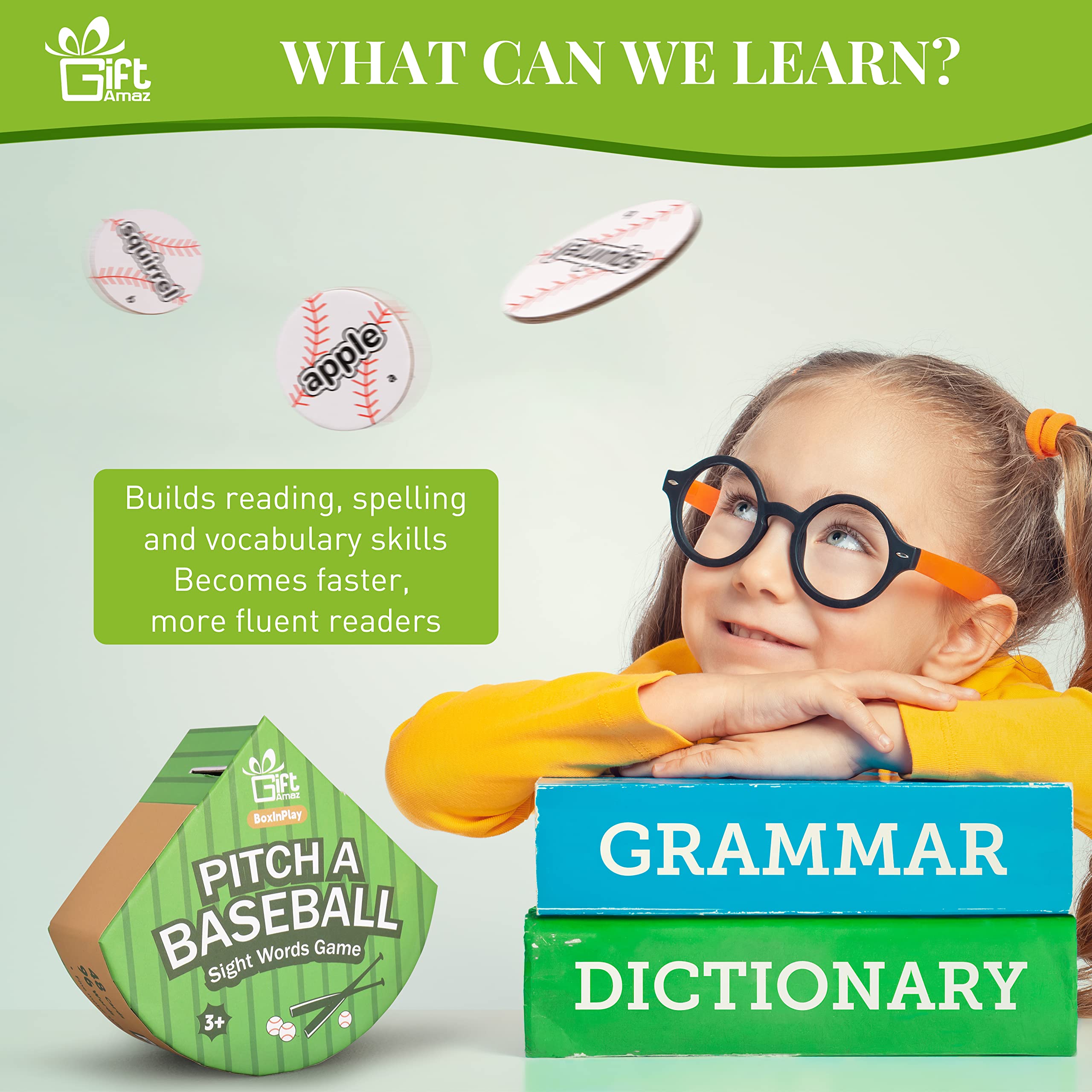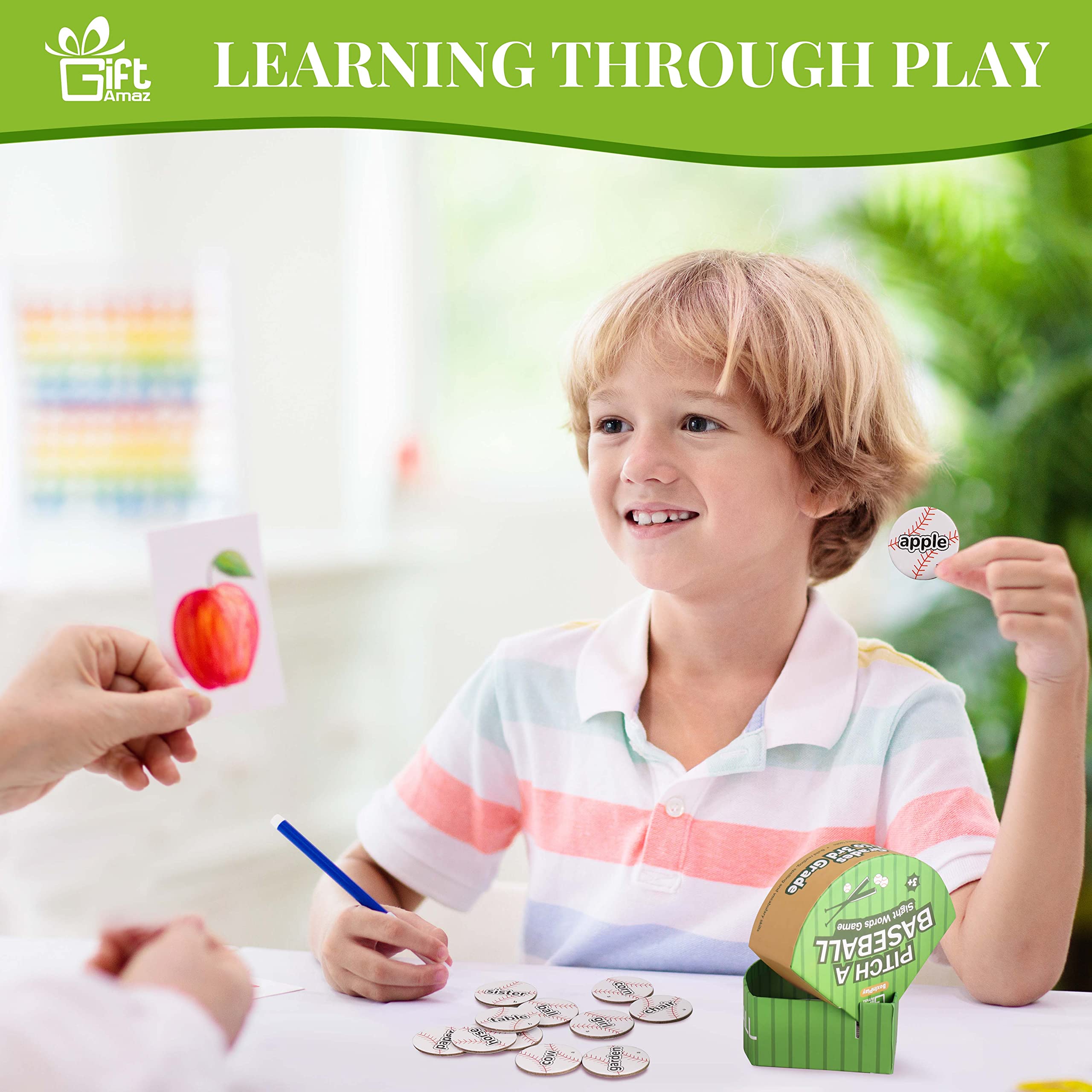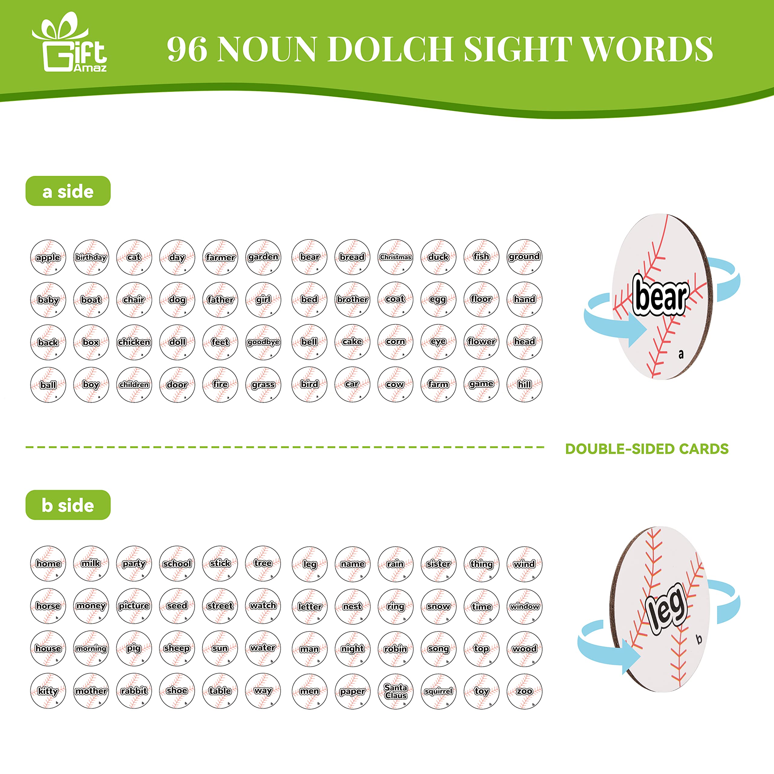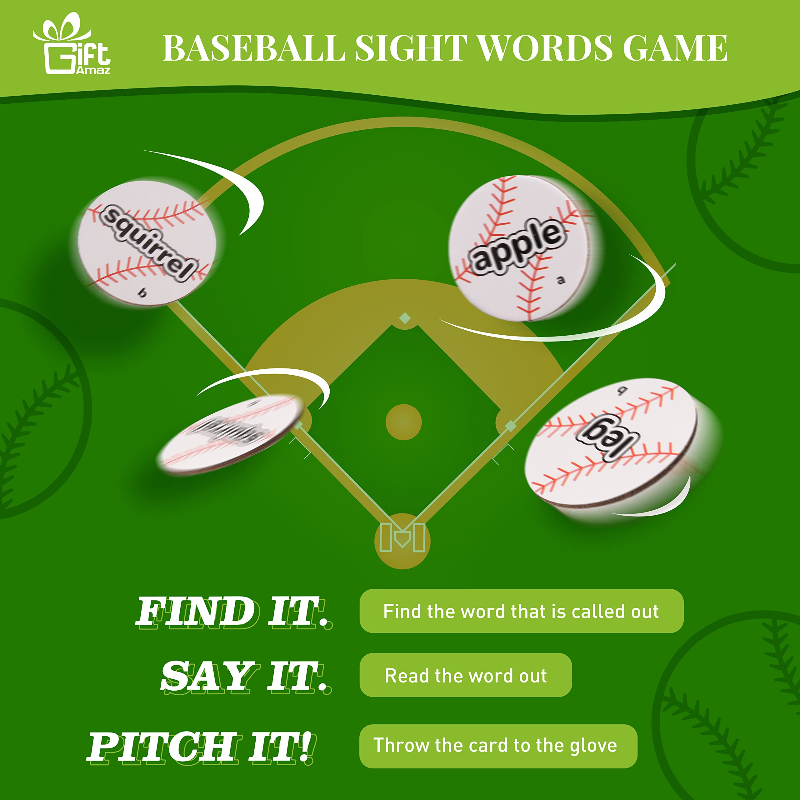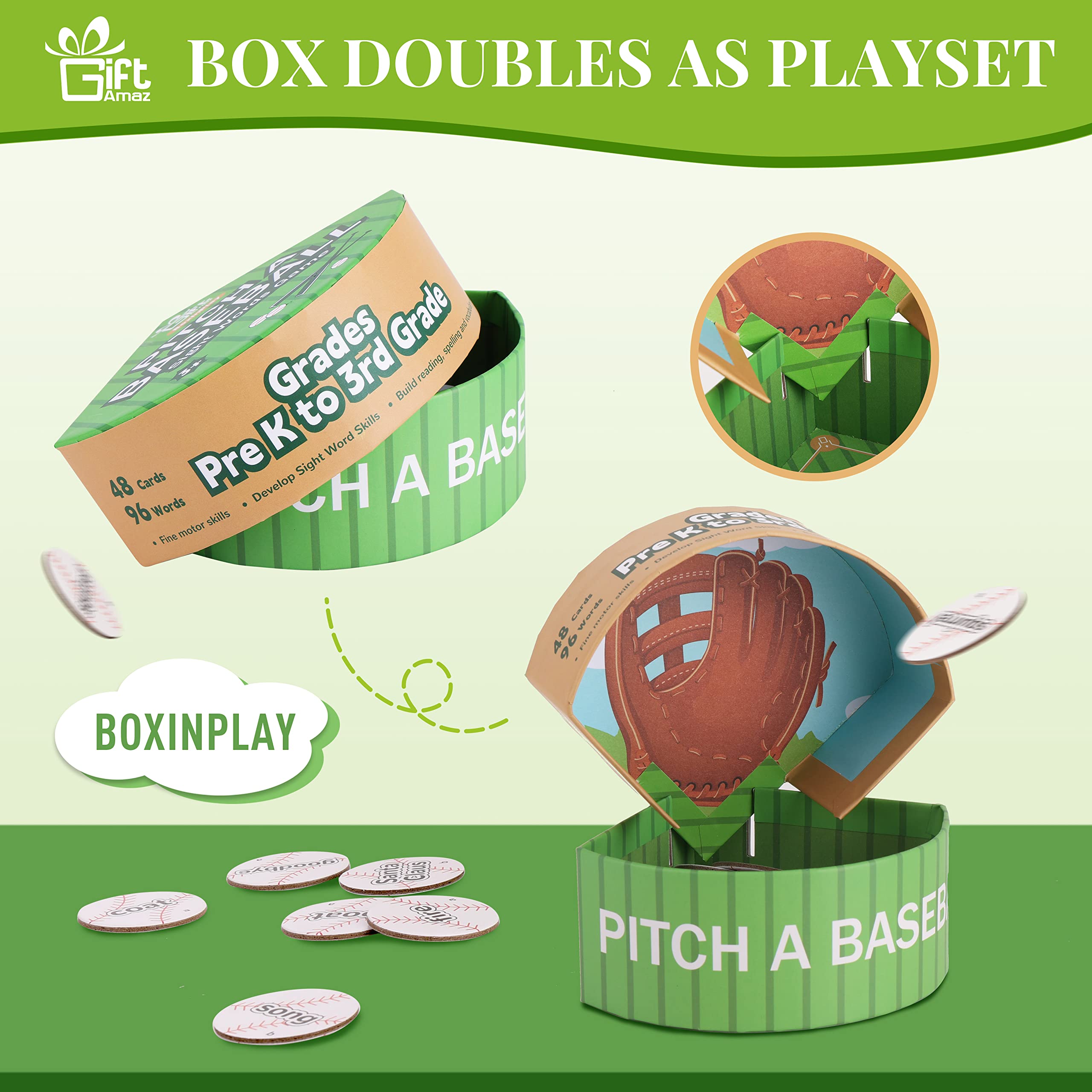 BASEBALL SIGHT WORD GAMES: Our sight words game set incorporates sight word learning into a unique and exciting baseball game, increasing the enjoyment of learning. Children can recognize, read, pronounce, spell, and master sight words through play, while also developing hand-eye coordination and reaction skills. For younger children, they can put the cards directly into the box to reduce the game's difficulty@BOX DOUBLES AS PLAYSET: The box can be used for both play and storage. Simply insert the lid into the slots and throw it aside. The printed glove inside adds to the realism of the baseball game experience for children. Additionally, the baseball box can encourage children to develop the good habit of tidying up by providing a designated storage space. Its compact size also makes it travel-friendly, allowing children to learn to read anywhere@LEARNING & EDUCATION TOYS: Kids can play with the sight words flashcards as if they were pitching a baseball, adding more fun to learning. They can play solo or with their parents or friends. In a multiplayer game, players must quickly grab and read the corresponding card after hearing the word read out loud, then throw it into the lid. This makes the game more intense and exciting@SIGHT WORD FLASH CARDS: There are a total of 48 double-sided baseball word flashcards, each printed with 96 different common nouns, labeled as "a" and "b" on each side. These high-frequency words are commonly used in general text, making mastering them a critical goal in education@IDEAL GIFT FOR KIDS: Our unique baseball-themed sight words learning set is a great gift for preschool kindergarten children aged 3-9. They will be delighted to receive this new-style learning material on birthdays, Christmas, back to school, or any holiday party. This is a great screen-free way for kids to learn through play