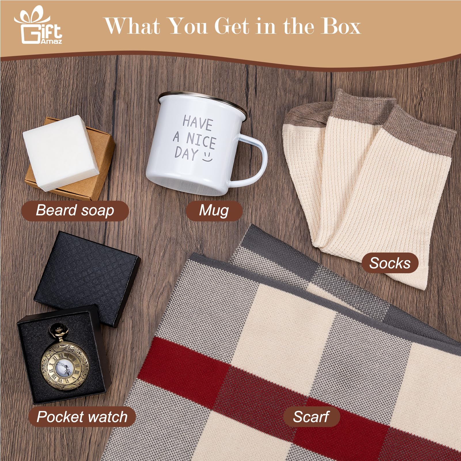 GET WELL GIFTS FOR MEN: Our care package for men includes an enamel coffee mug, a vintage pocket watch, a cozy scarf, a pair of soft socks, and a shaving soap. Each item in this gift box is carefully selected to be both attractive and practical, ensuring that your loved one will appreciate every piece@VINTAGE GIFT BOX: The get well soon gift basket is filled with a nostalgic vintage vibe from the inside out. From the packaging box to the inner wrapping paper, it includes many retro elements. This men gift basket combines practicality with nostalgic charm, making it perfect for expressing your care and love@PREMIUM QUALITY: We pay great attention to detail and ensure the high quality of each item. The enamel mug is sturdy and stylish, with a smooth glaze, perfect for morning coffee; the pocket watch is intricately engraved, adding a touch of elegance to daily life; the plaid scarf is made from a blend of acrylic and wool, warm and comfortable, along with cotton cream-colored socks and shaving soap@VARIOUS OCCASIONS: The feel better gifts box is a versatile gift suitable for any occasion, whether as a get well soon gift, a sympathy gift basket, or for Father's Day, birthdays, Christmas, and other festive parties. It is a thoughtful gift for dads, brothers, and best friends, symbolizing love and care@THINKING OF YOU GIFT SET: Use this self care gifts to express your love and support. The soft scarf and comfortable cotton socks are perfect for cold nights or recovery periods, and the coffee mug with handle printed with "HAVE A NICE DAY" adds a touch of loving blessing. This is not just a gift, but a warm hug in a box