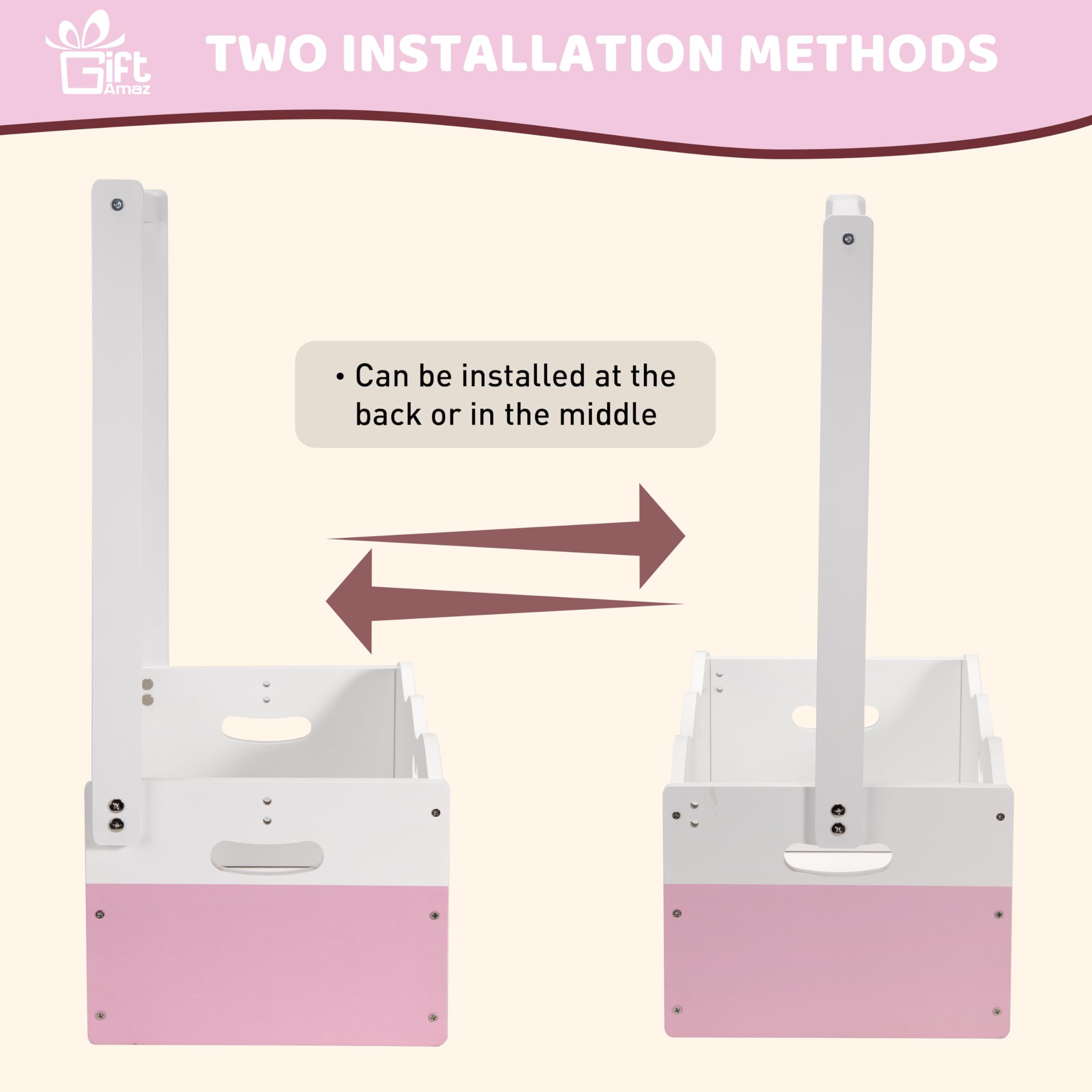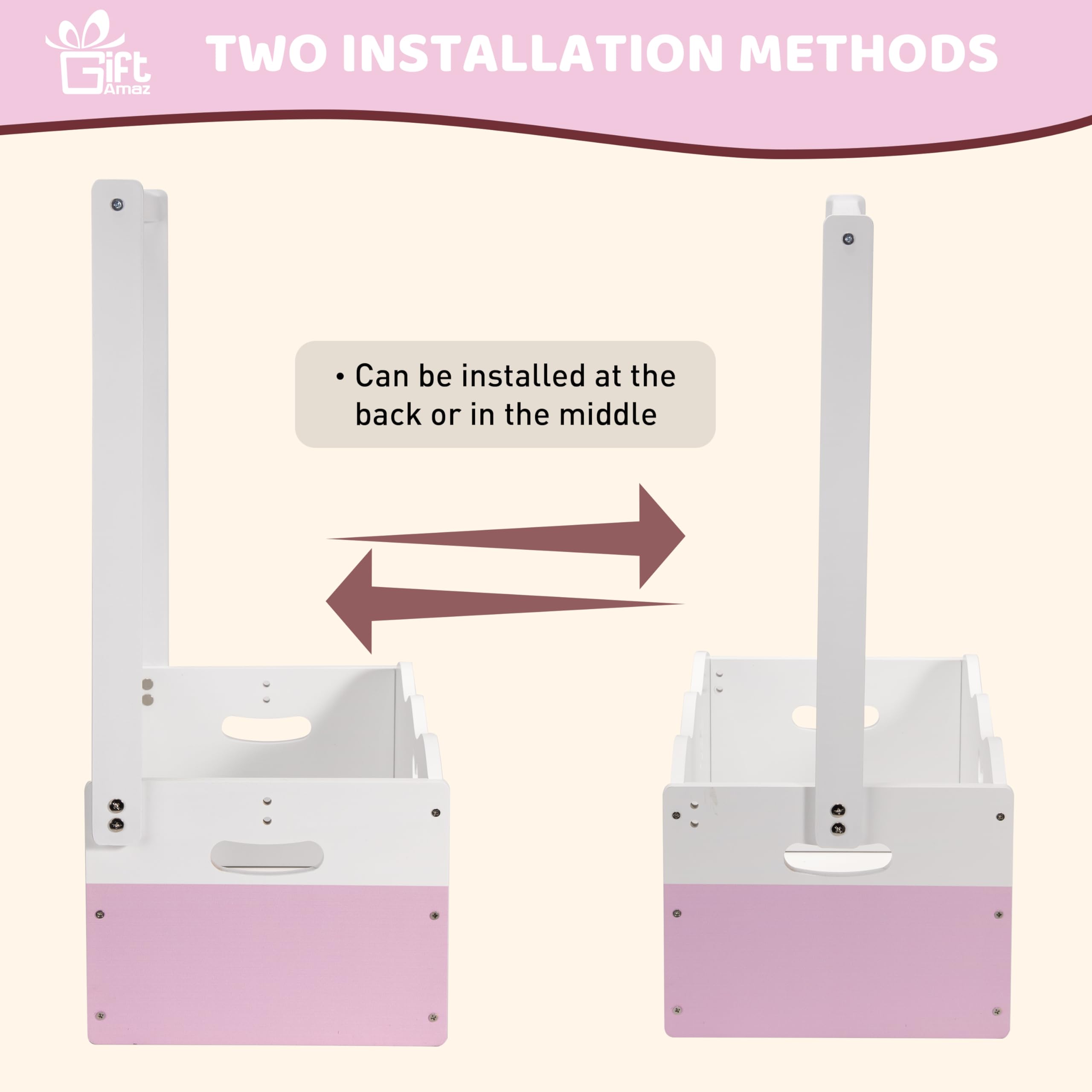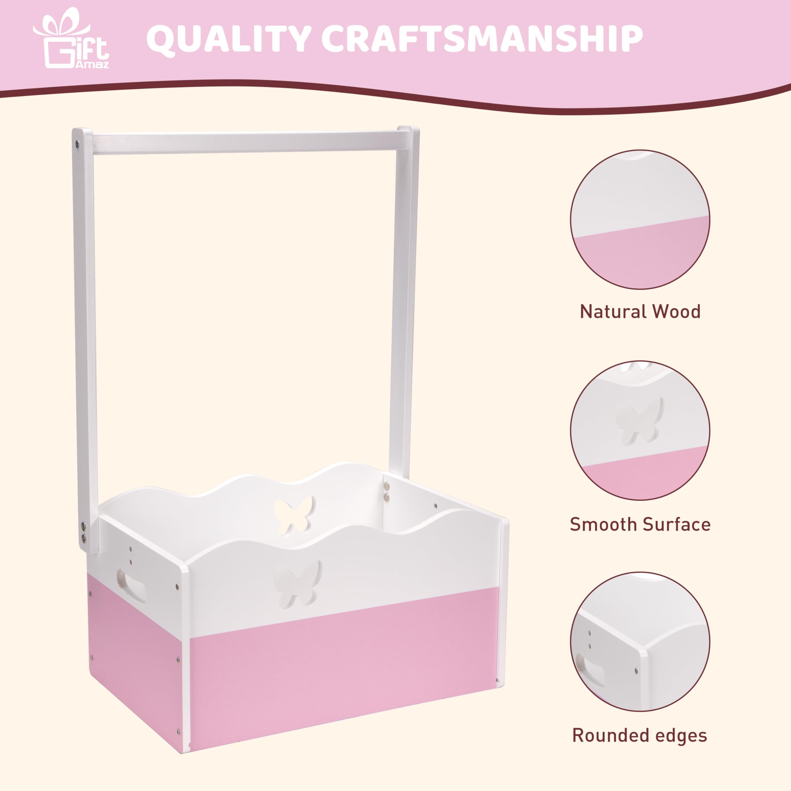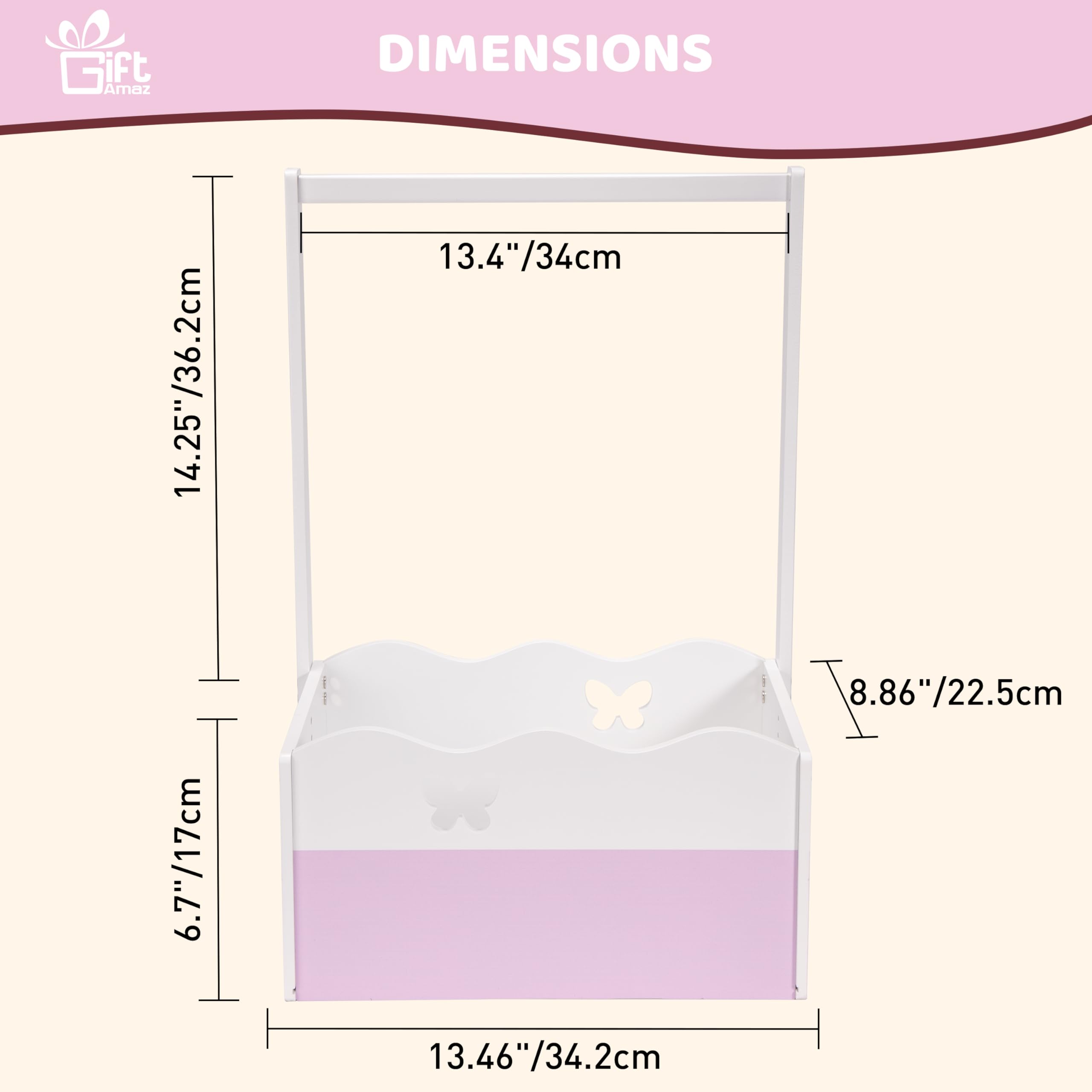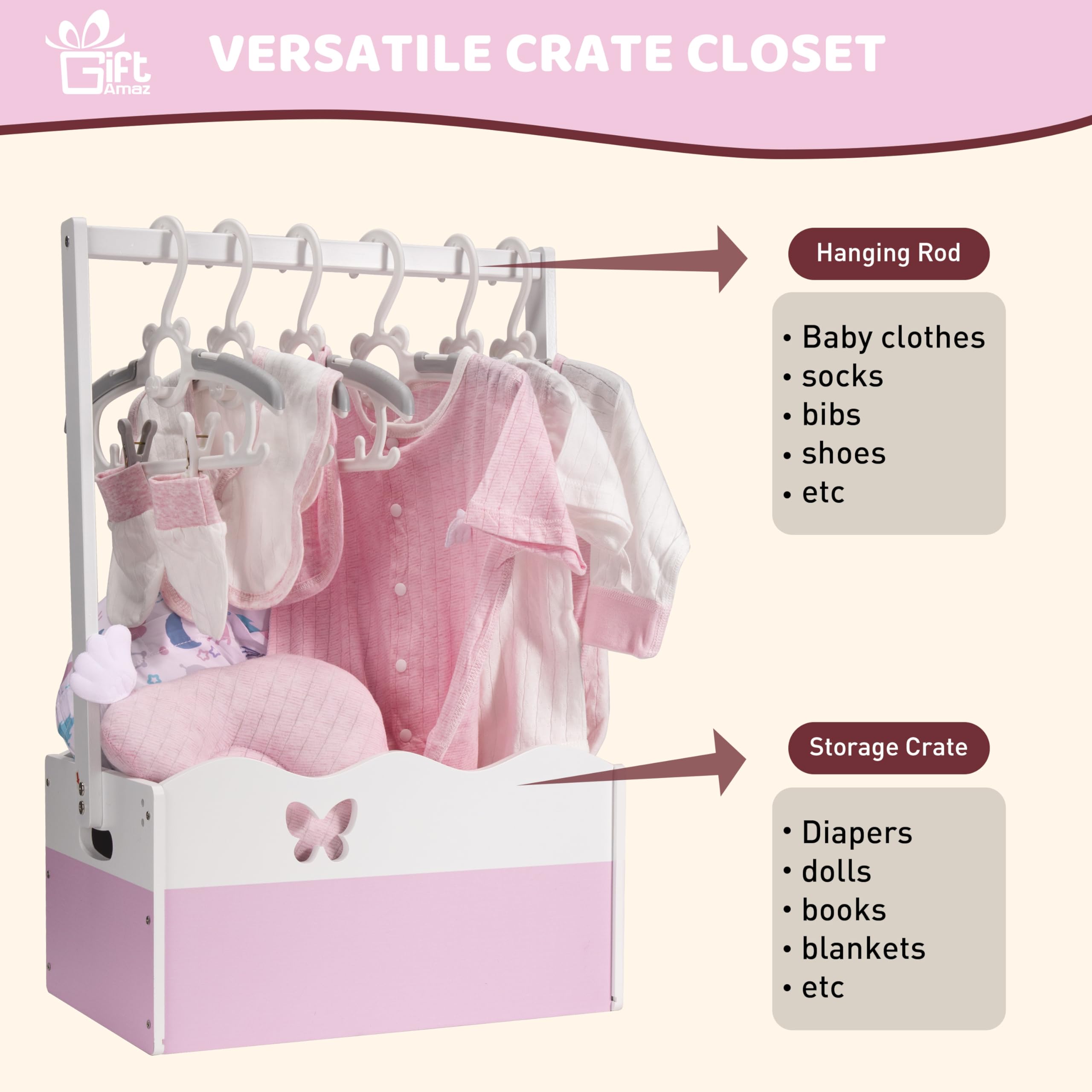 Baby Girl Gifts Basket: The pink wooden baby shower crate closet serves as a classic gifts container for baby showers. Its timeless design and excellent wood make it stand out at any event. The pink and white color scheme is great for celebrating a baby girl's shower, especially those with princess or floral themes. This gifts basket represents your sentiments, adding a touch of elegance to your present@Dual Function: This baby storage crate hamper with handle offers dual functionality of storage and hanging. Compared to other gifts containers that only provide storage, our baby shower crate box comes with a spacious crate and hanging rack, enriching the display form, making it a practical and stylish choice@Unleash Your Imagination: You can unleash your imagination to DIY decorate this baby shower gifts basket in any way that is unique and meaningful to you. You can choose to add ornaments, decorate it with artificial flowers, ribbon and bows. This baby shower crate is waiting for your creative decoration (The assembled wooden crate measures 13.46"L x 8.86"W x 20.95"H.)@Good Quality: This baby welcome box is made from excellent wood, ensuring sturdiness and durability to hold various gifts. The surface is painted in pink and white, and the front and back panels are designed with unique hollow patterns of butterfly, making it more beautiful. This baby gifts basket is not only practical but also a piece of art (THE WOOD CRATE ONLY, NOT INCLUDE THE DECORATION ITEMS!)@Multi-Purpose: In addition to baby gifting, this baby basket with handle can be used for a variety of occasions. It is suitable for storing baby essentials in the nursery, or as a decoration in a child's room, or even for solving storage problems anywhere in the home. Its classic design ensures it will never go out of style