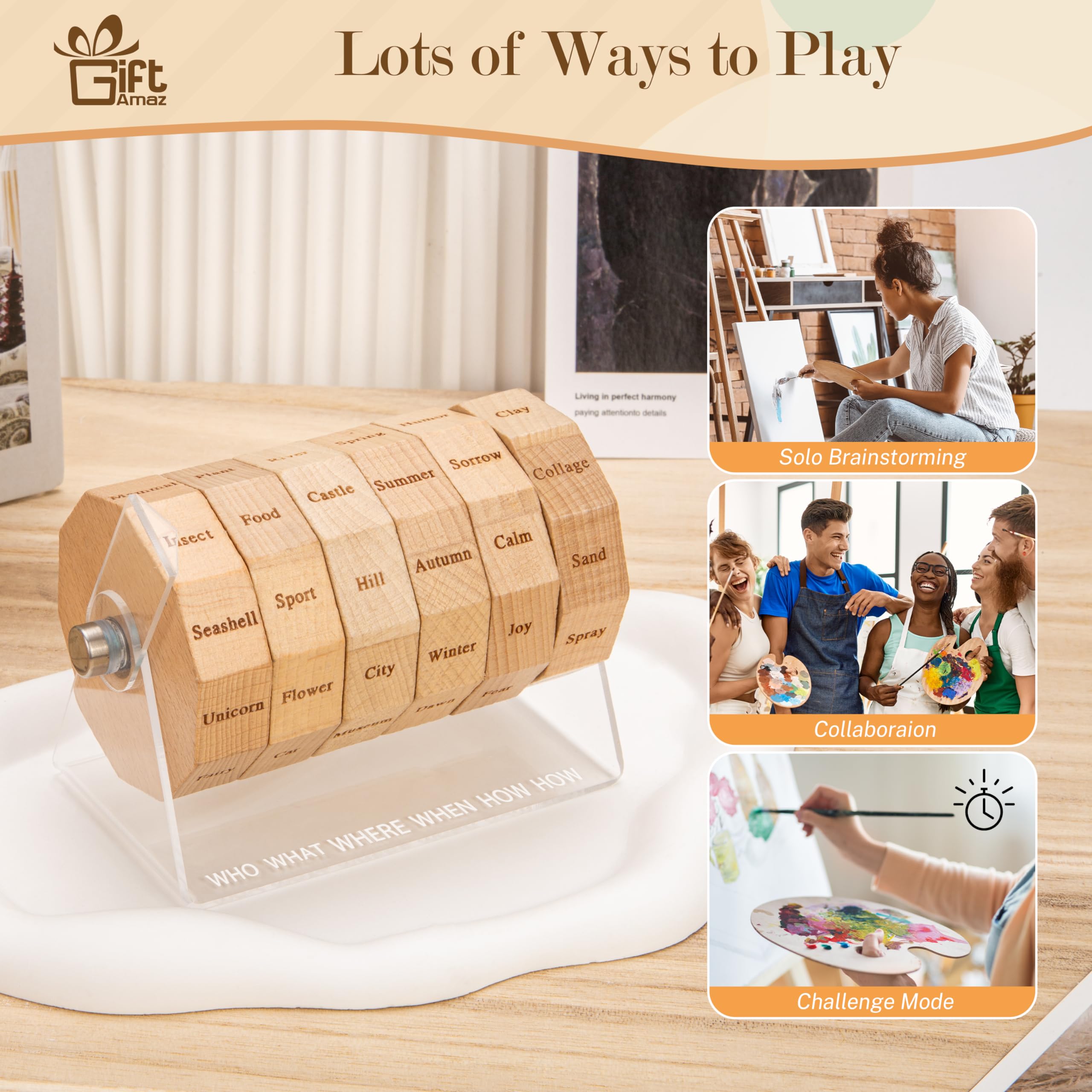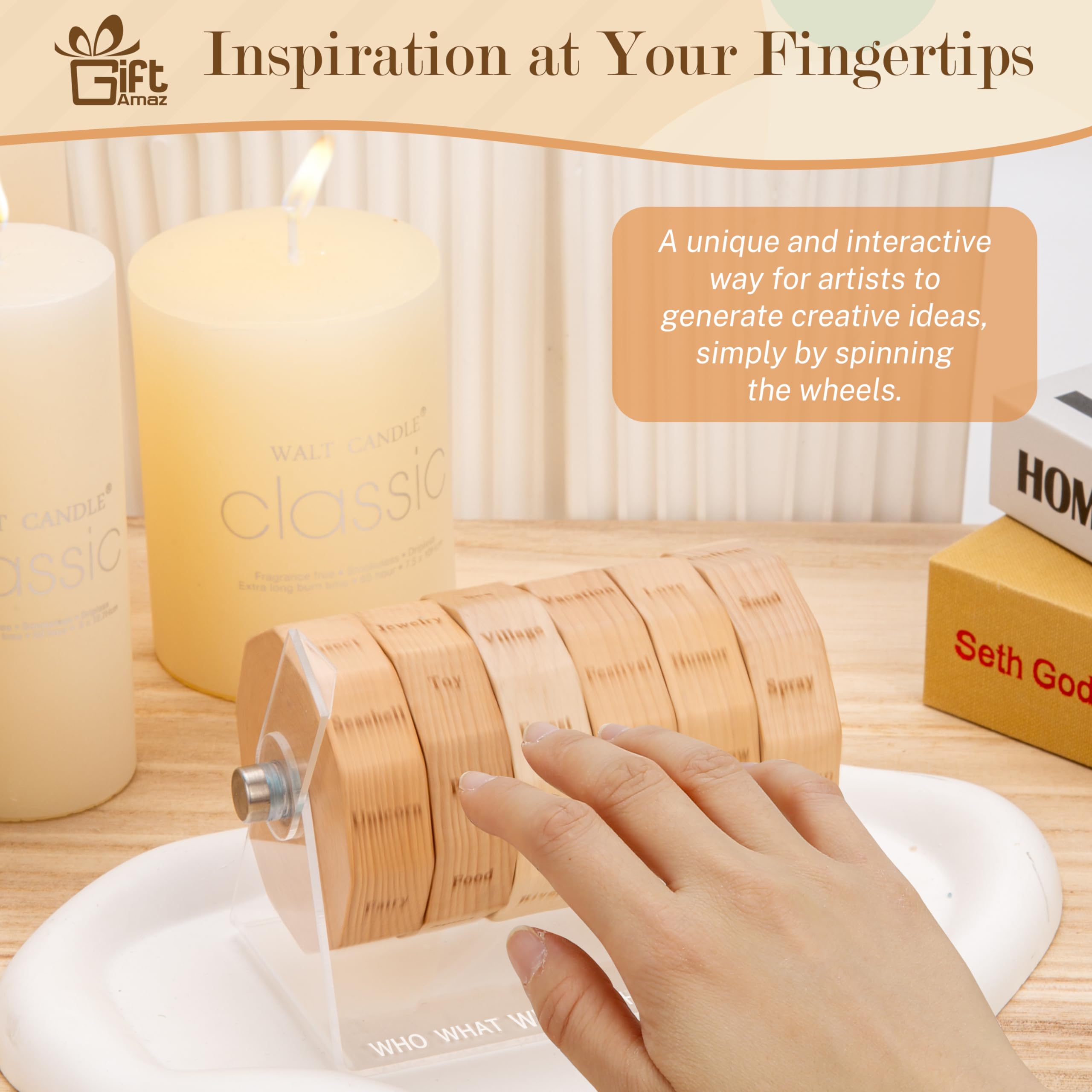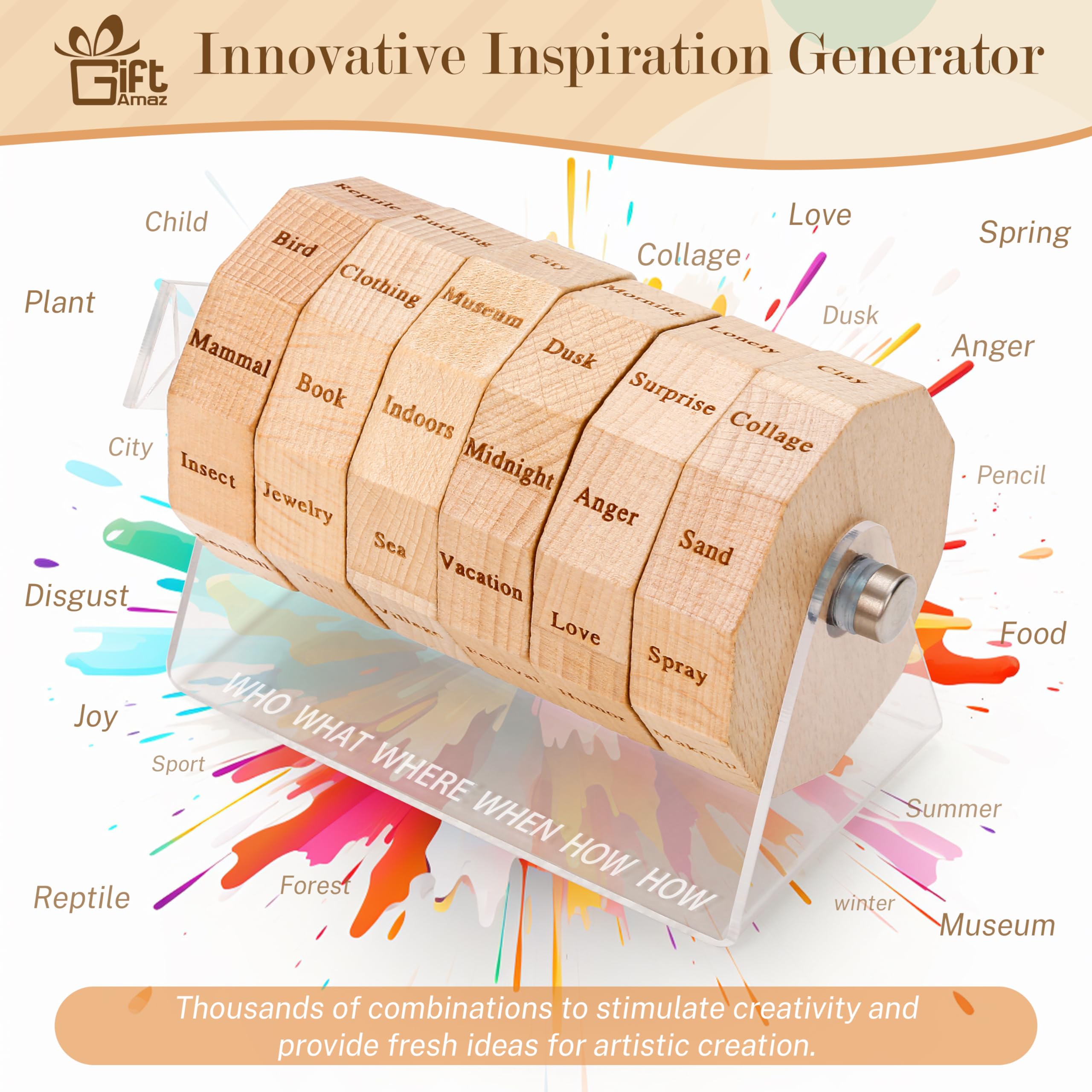 NEW SOURCES OF INSPIRATION: Our art spinner is an innovative tool designed to spark your artistic imagination. Just spin the wheel to kick-start your artistic creation process. For artists seeking to overcome creative blocks, this is an ideal solution to inspire creativity@THOUSANDS OF COMBINATIONS: The art spinner offers thousands of combinations. The art wheel is arranged in the order of "who, what, when, where, how", making the artwork more logical and visually effective. Its unique arrangement helps to construct your thoughts and ideas, helping you create artworks or writing work with more visual impact and appeal@MULTIPLE GAME MODES: The art game is not only suitable for individual use, it's also an ideal choice for teaching, group collaboration, and fun games with family and friends. Whether you're brainstorming alone, collaborative creation, or participating in timed challenges, this art drawing game adds more fun to your creative process@QUALITY MATERIAL: The art tool is made of high-quality acrylic and natural beech, which is not only practical but also stylish. Its spinner is finely crafted and can serve as a stylish desktop accessory for artists. It's an art game that seamlessly blends function with aesthetics@UNIQUE GIFTS FOR ARTISTS: Looking for a creative gift for artists, teachers, writers or art students? Our art dice is a perfect choice. It's a source of inspiration and a new way to explore the art world. It's a gift that keeps on inspiring, each spin sparking creativity and joy