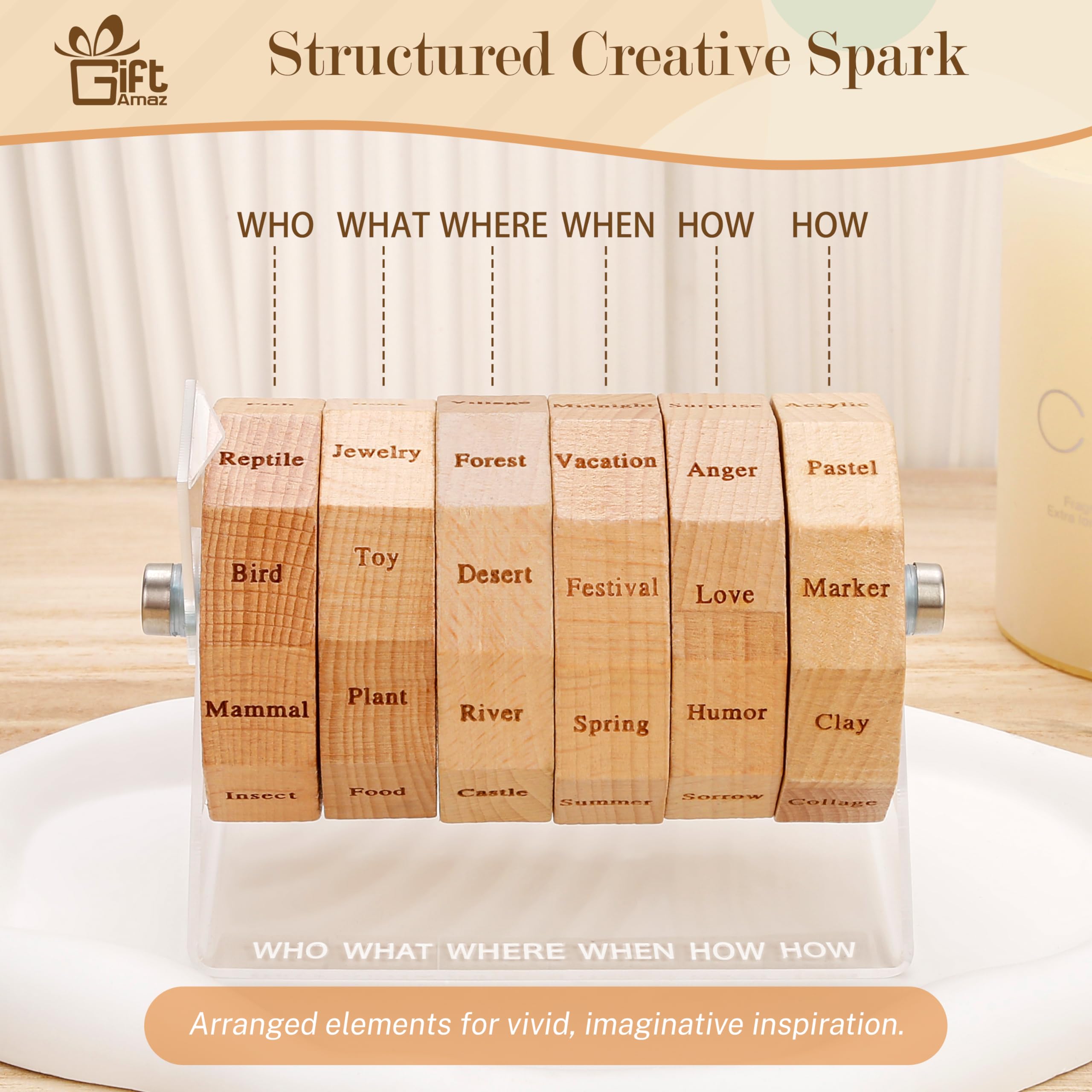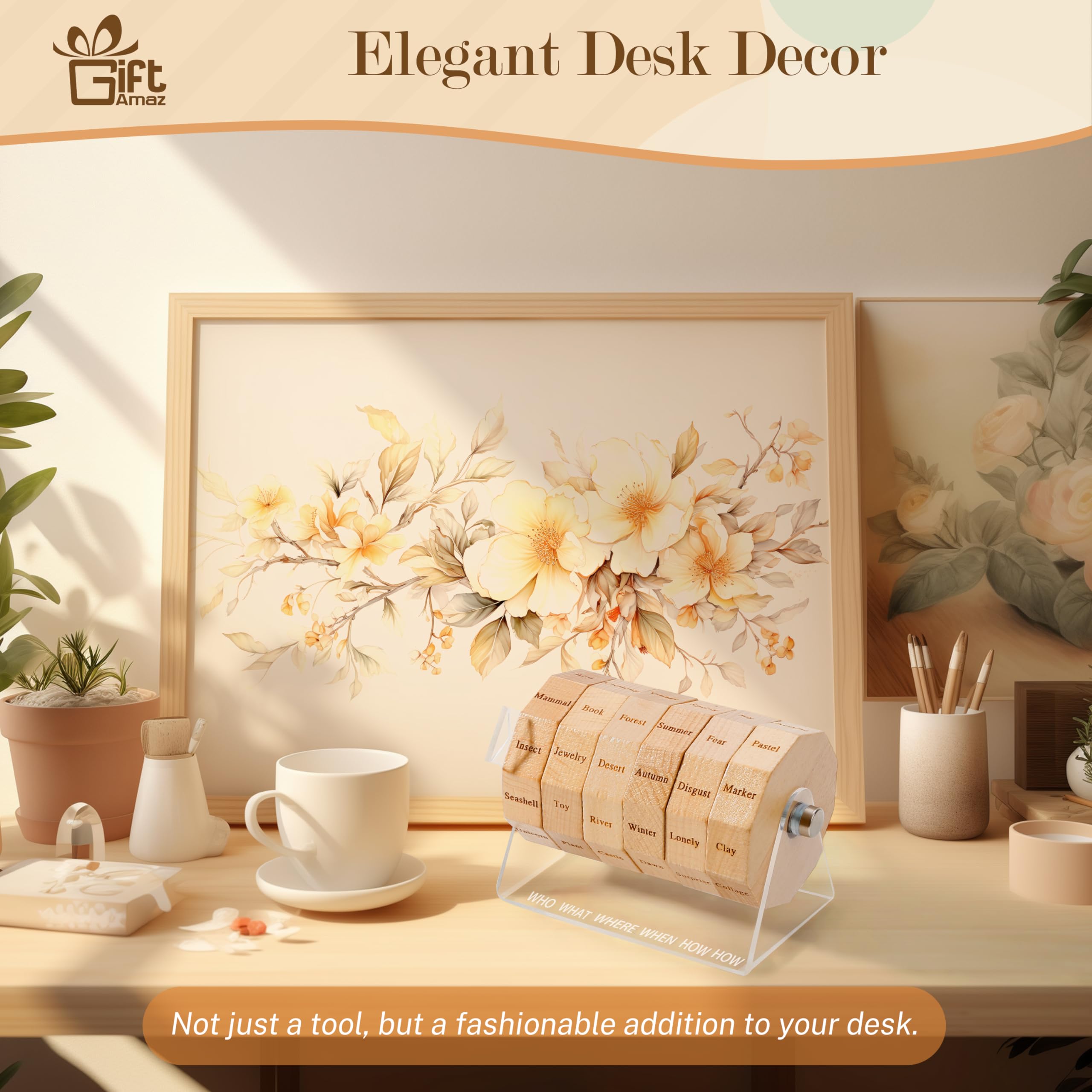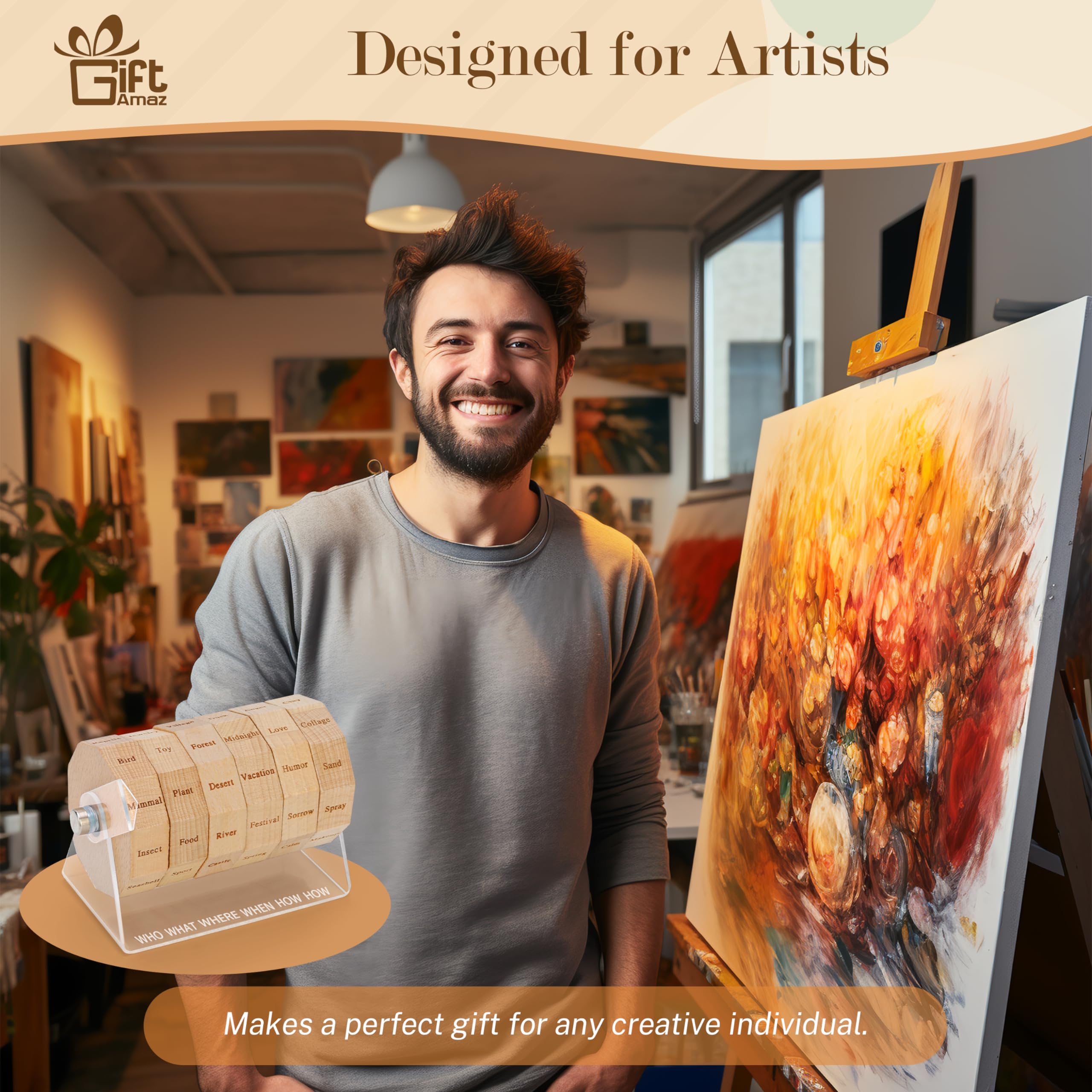 NEW SOURCES OF INSPIRATION: Our art spinner is an innovative tool designed to spark your artistic imagination. Just spin the wheel to kick-start your artistic creation process. For artists seeking to overcome creative blocks, this is an ideal solution to inspire creativity@THOUSANDS OF COMBINATIONS: The art spinner offers thousands of combinations. The art wheel is arranged in the order of "who, what, when, where, how", making the artwork more logical and visually effective. Its unique arrangement helps to construct your thoughts and ideas, helping you create artworks or writing work with more visual impact and appeal@MULTIPLE GAME MODES: The art game is not only suitable for individual use, it's also an ideal choice for teaching, group collaboration, and fun games with family and friends. Whether you're brainstorming alone, collaborative creation, or participating in timed challenges, this art drawing game adds more fun to your creative process@QUALITY MATERIAL: The art tool is made of high-quality acrylic and natural beech, which is not only practical but also stylish. Its spinner is finely crafted and can serve as a stylish desktop accessory for artists. It's an art game that seamlessly blends function with aesthetics@UNIQUE GIFTS FOR ARTISTS: Looking for a creative gift for artists, teachers, writers or art students? Our art dice is a perfect choice. It's a source of inspiration and a new way to explore the art world. It's a gift that keeps on inspiring, each spin sparking creativity and joy